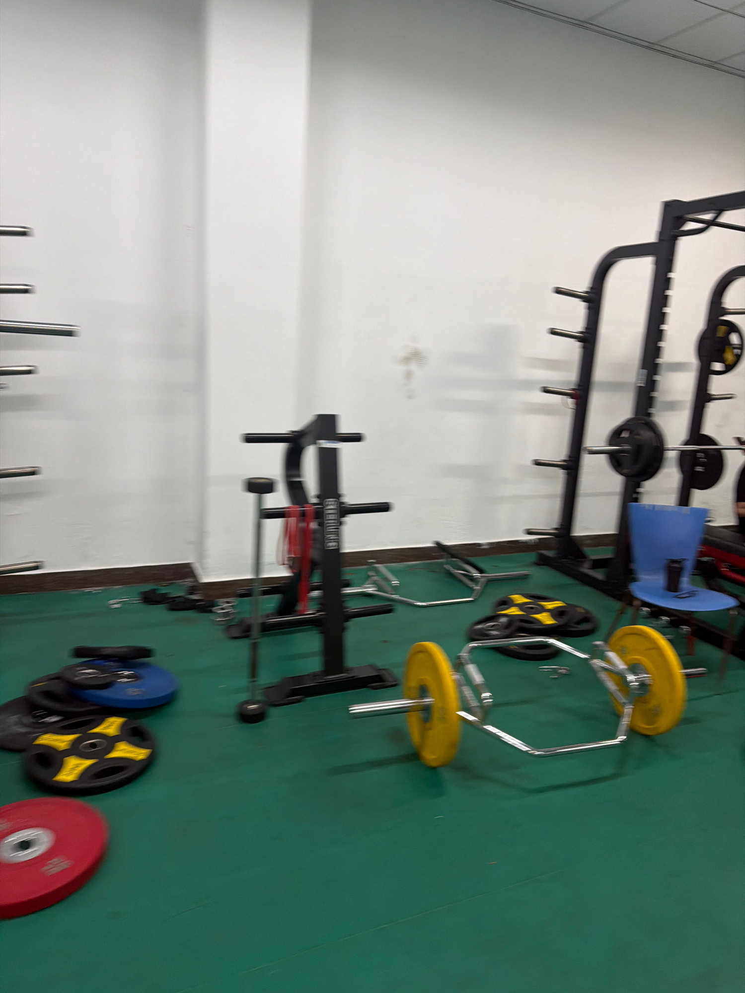 The image shows a gym with various weightlifting equipment. The equipment includes a power rack, a landmine attachment, a hex bar with yellow weight plates, and several weight plates of different colo…read more