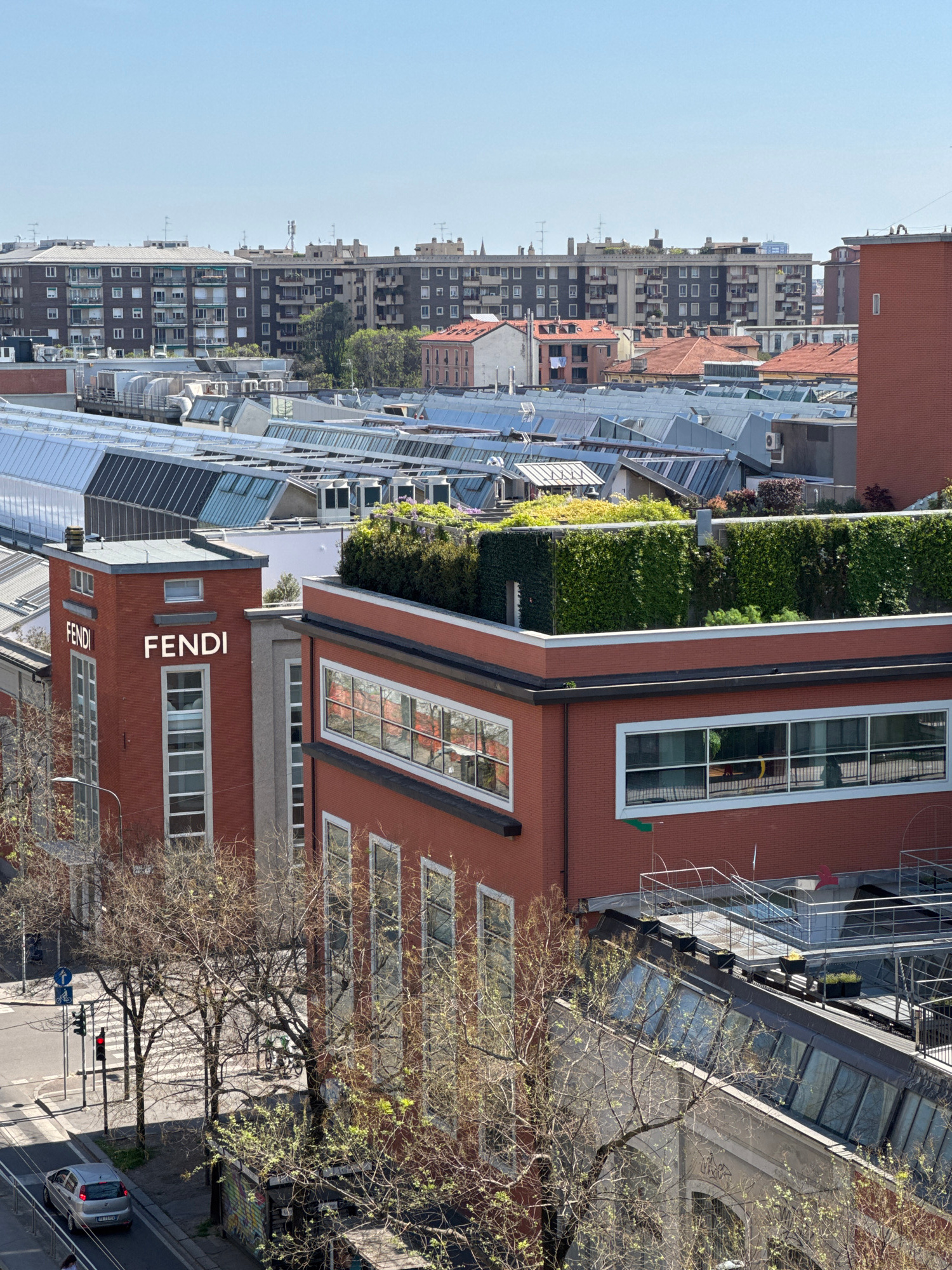 The image is an elevated view of a street scene in Milan, Italy, dominated by buildings. The most prominent building is a red brick structure with the word "FENDI" vertically displayed on its facade.…read more