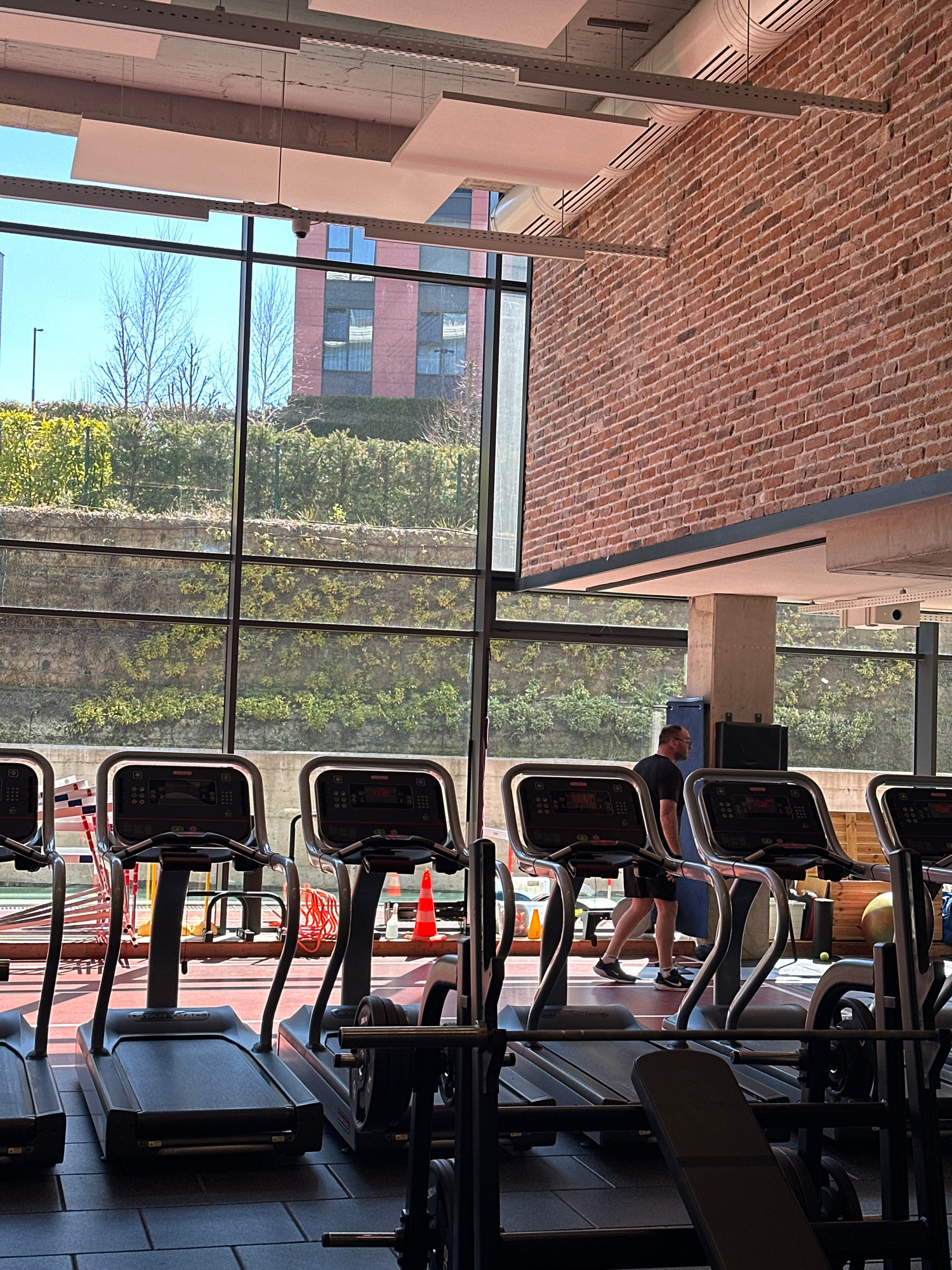 The photograph depicts the interior of a fitness center in Sofia, Bulgaria. Several treadmills are lined up in a row, facing a large window. A man is using one of the treadmills, and outside the windoβ¦read more