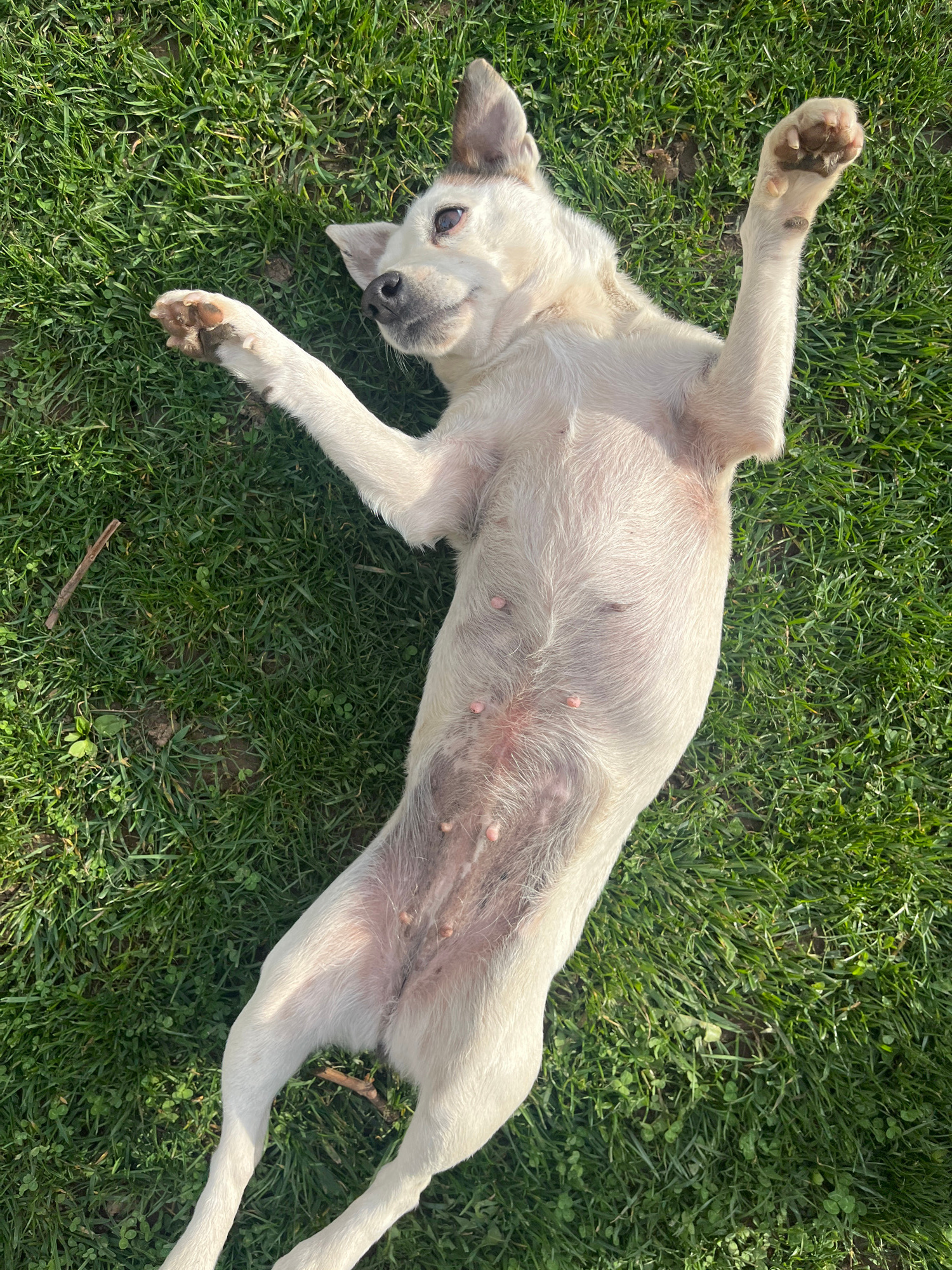 A medium-sized, white dog lies on its back on green grass. The dog's legs are splayed out, and its belly is exposed, revealing a row of nipples. The dog's head is tilted to the side, and it appears to…read more