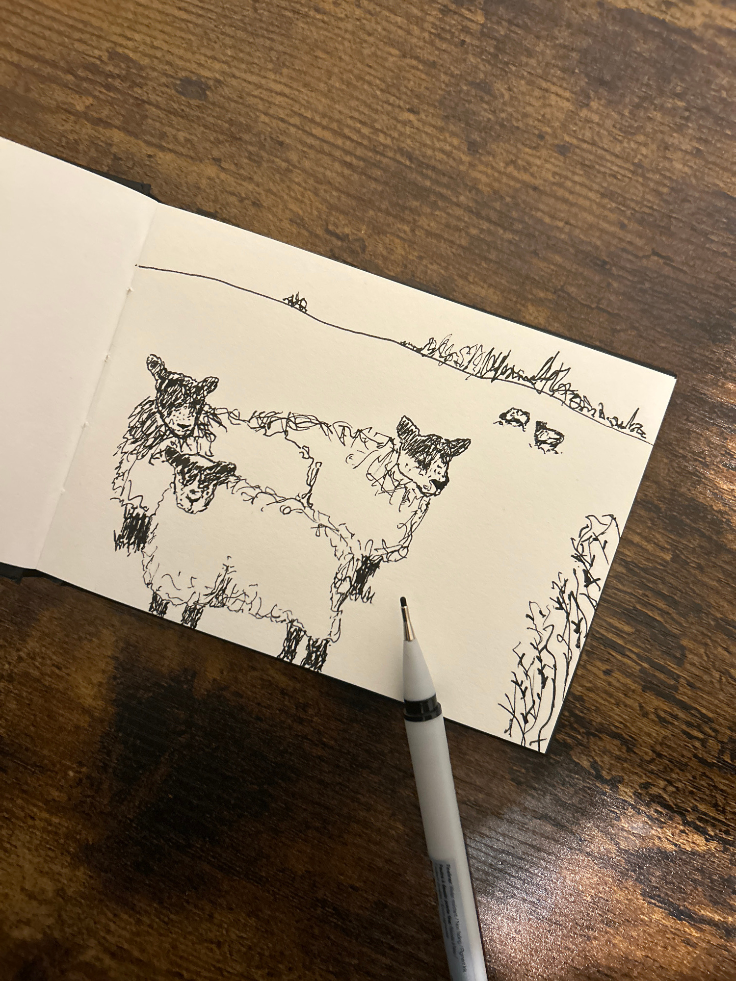 A hand-drawn sketch in black ink on white paper depicts two sheep. The background includes a simple depiction of grass and trees. A grey pen lies on the paper near the sketch. The sketch is on a noteb…read more