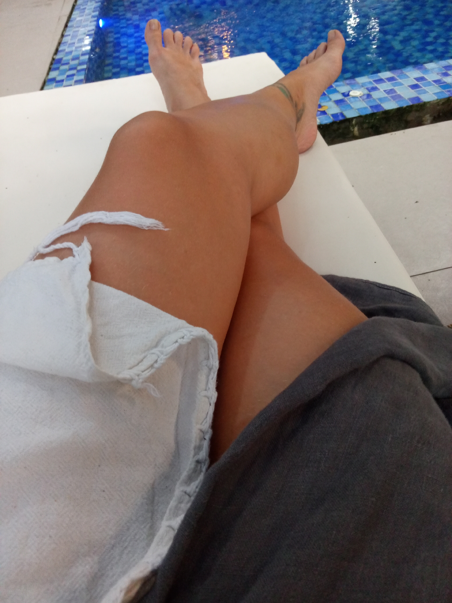 A close-up shot shows a person relaxing on a white lounge chair beside a pool. The person has their legs crossed, with a white garment draped over the left leg and a grey one on the right. The feet ar…read more