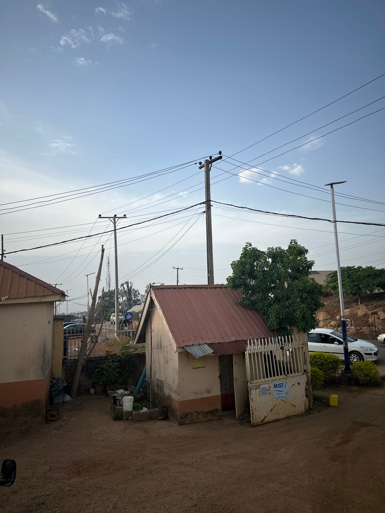 This image depicts a street scene in Jos, Nigeria. A dirt road runs along the right edge of the frame, bordered by buildings. The buildings appear weathered, with some having rusted metal roofs and pa…read more