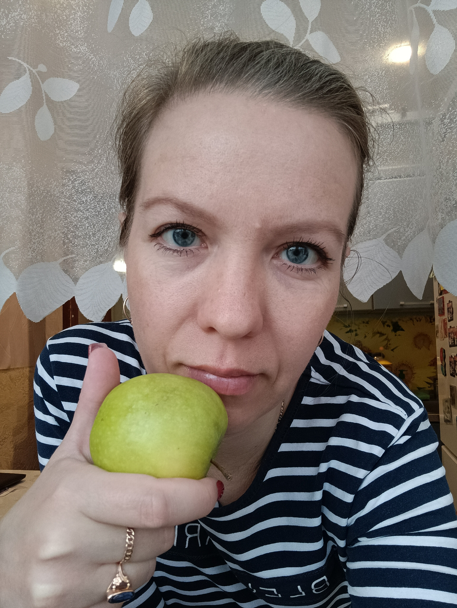 A woman with light brown hair, pulled back, looks directly at the camera in a close-up, chest-up shot. Her blue eyes are prominent, and she has a neutral to slightly serious expression with lightly gl…read more