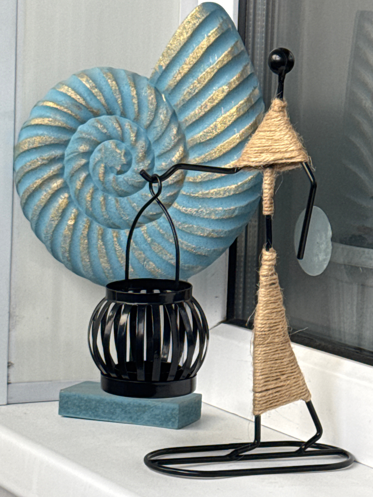 The image depicts a decorative object indoors. The object consists of a stylized metal figurine wrapped with twine, a blue and gold seashell design, and a cylindrical metal and blue base. The figurine…read more
