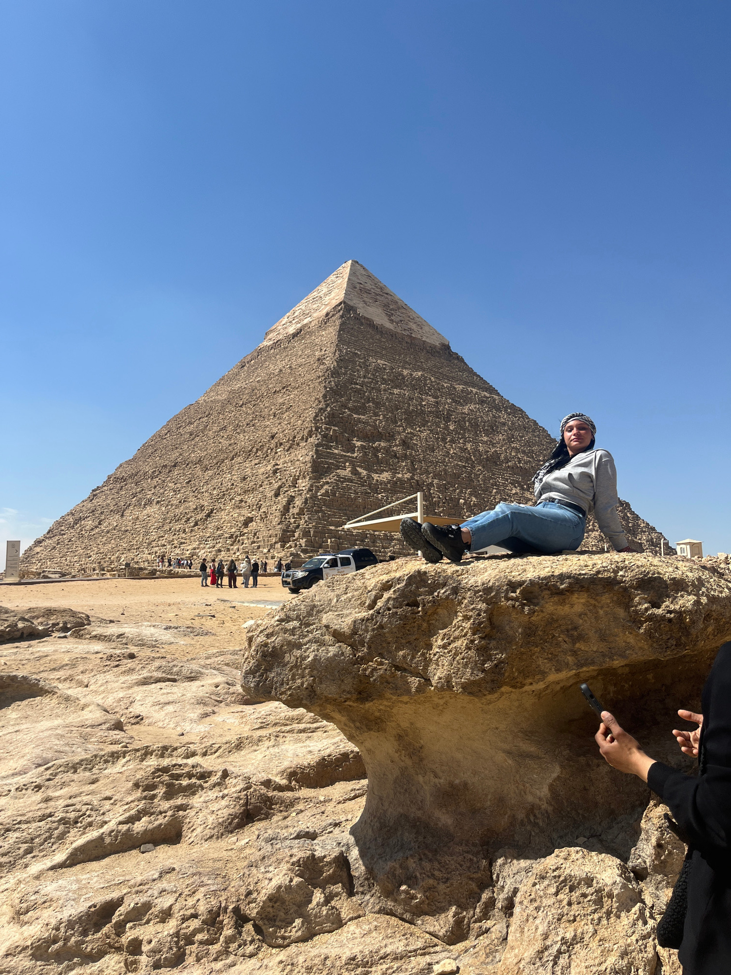 The image shows a person climbing on the Great Pyramid of Giza in Giza, Egypt. The person, wearing a gray sweatshirt, blue jeans, and dark shoes, is positioned on a section of the pyramid near the topβ¦read more