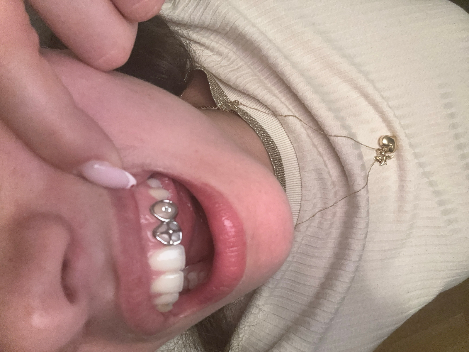A close-up shot shows a person with a dental bridge on their upper teeth. The bridge appears to be made of metal and porcelain. The person's lips are slightly parted, revealing the bridge and the adja…read more