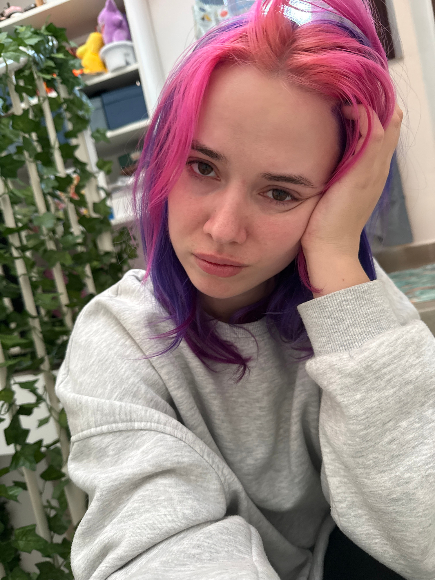 A young woman with vibrant pink and purple hair is the focal point of the image. She wears a light gray hooded sweatshirt and rests her head on her hand. The background features green ivy-like plants,…read more