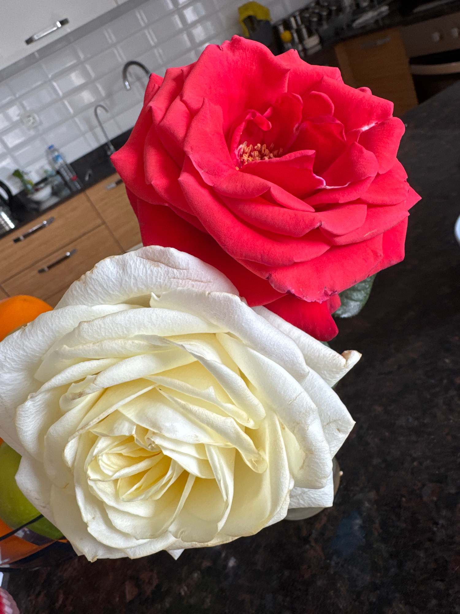 Two roses are displayed in the image. One rose is red, and the other is white. The roses are positioned close together, with the red rose to the left of the white rose. The background is blurred but a…read more