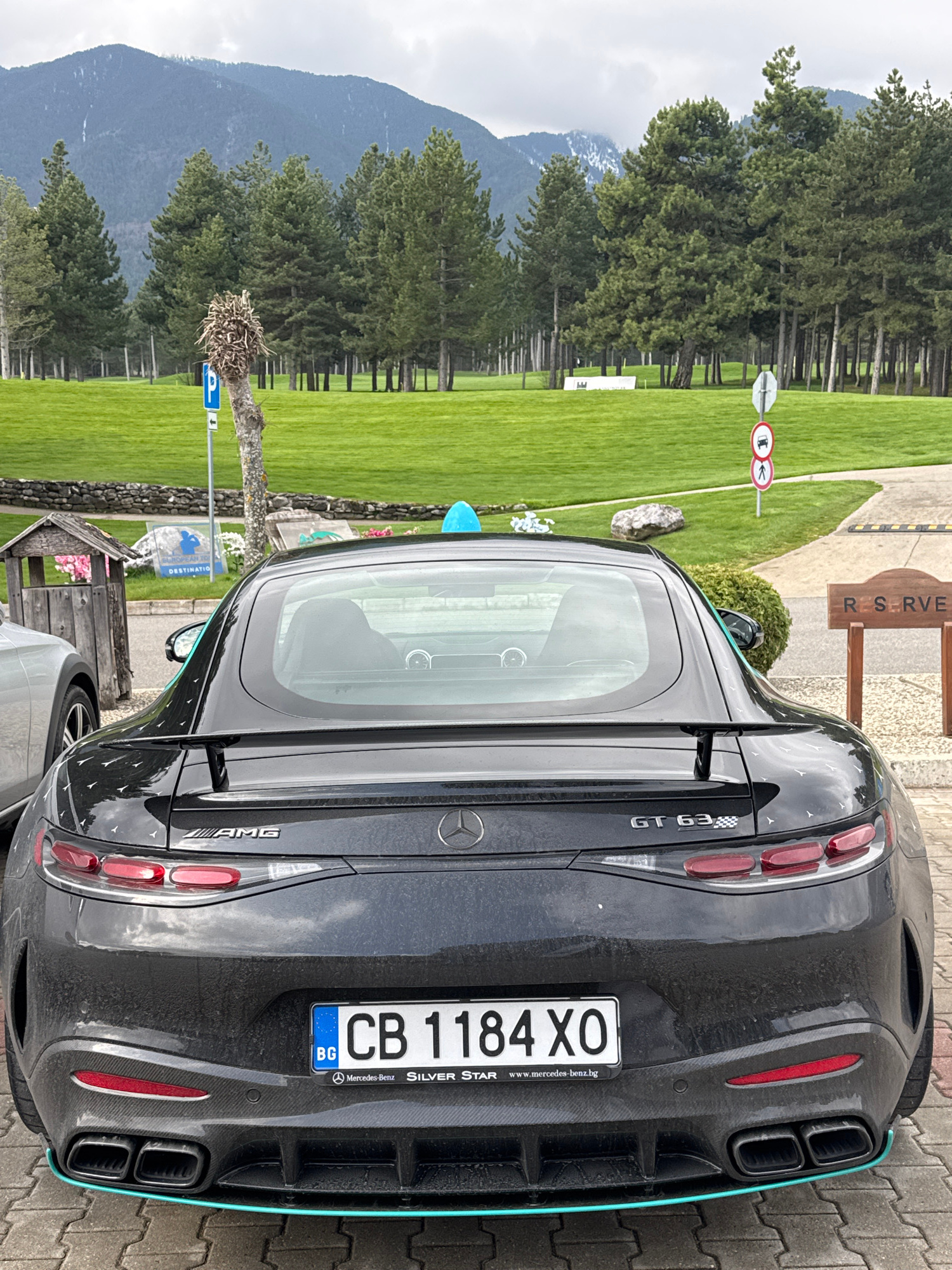 The image displays the rear passenger side of a dark grey Mercedes-AMG GT 63 Coupe, parked outdoors in Razlog, Bulgaria. The car features a prominent rear spoiler, dual exhaust pipes, and a distinctiv…read more
