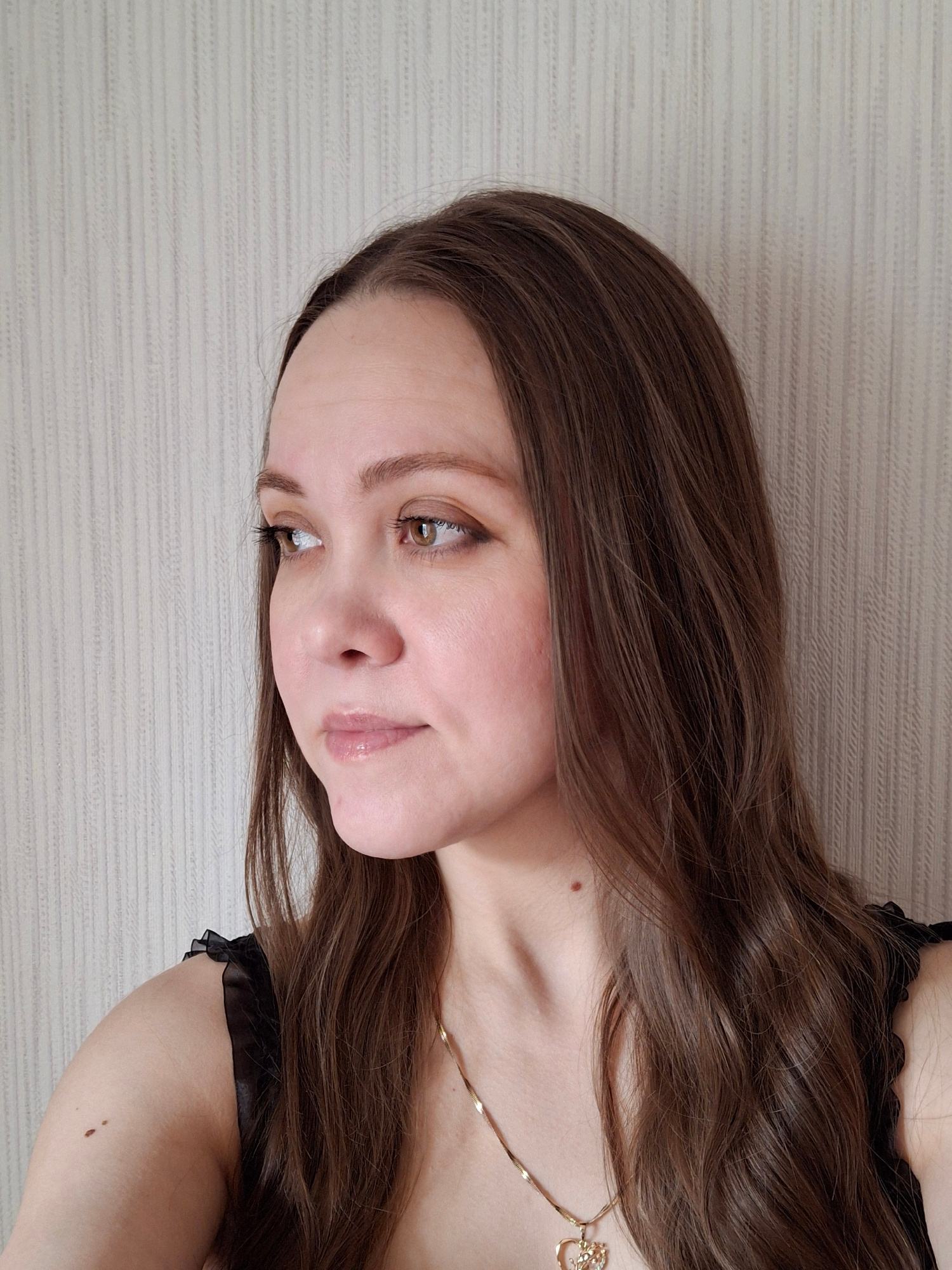 A young woman with long, light brown hair is visible from the chest up. She is wearing a black top with ruffled detailing. A thin gold necklace is around her neck. The woman is looking towards the vie…read more