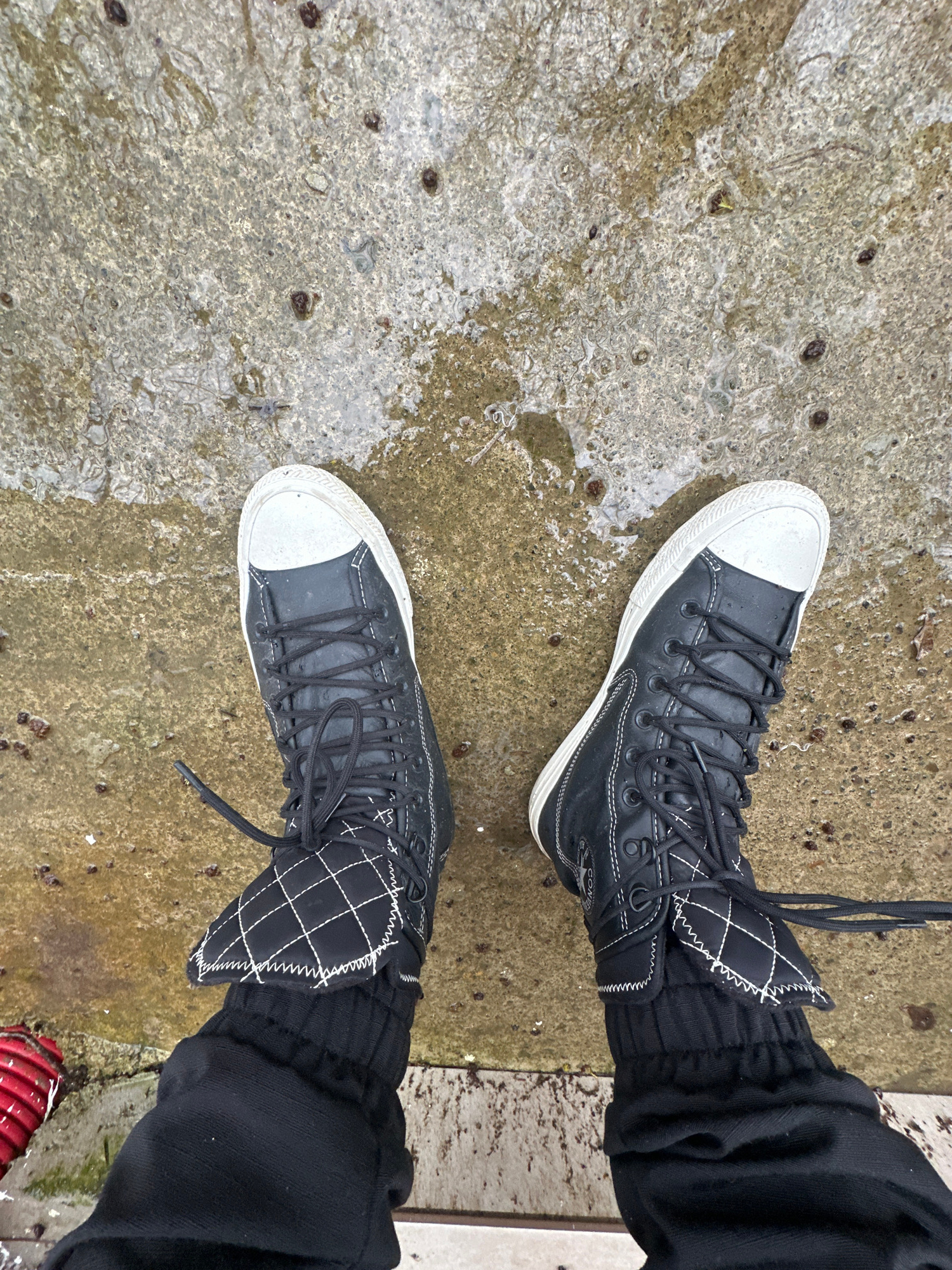 The image shows a view of two black Converse high-top sneakers with white toe caps, laces, and detailing. The shoes are being worn by a person, whose legs are clad in black cuffed pants. The ground ap…read more