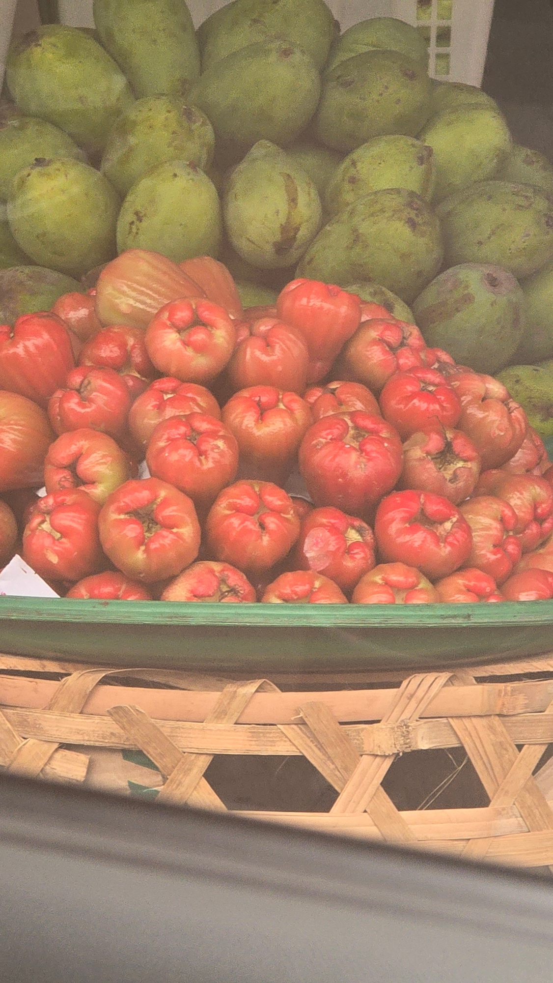 This image displays a vibrant assortment of fresh tropical fruits, likely from a market in Ubud District, Indonesia. The scene is dominated by two large piles of different fruits, arranged side-by-sid…read more