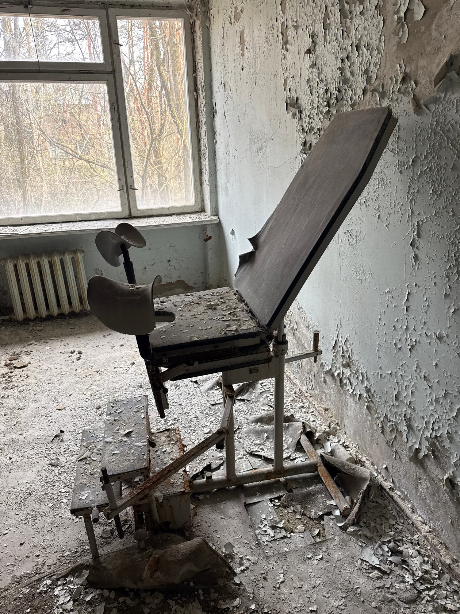 An abandoned medical room in Prypiat, Ukraine. A rusted examination table is in the center, positioned near a window revealing bare trees. The walls and ceiling show extensive peeling paint and decay.…read more