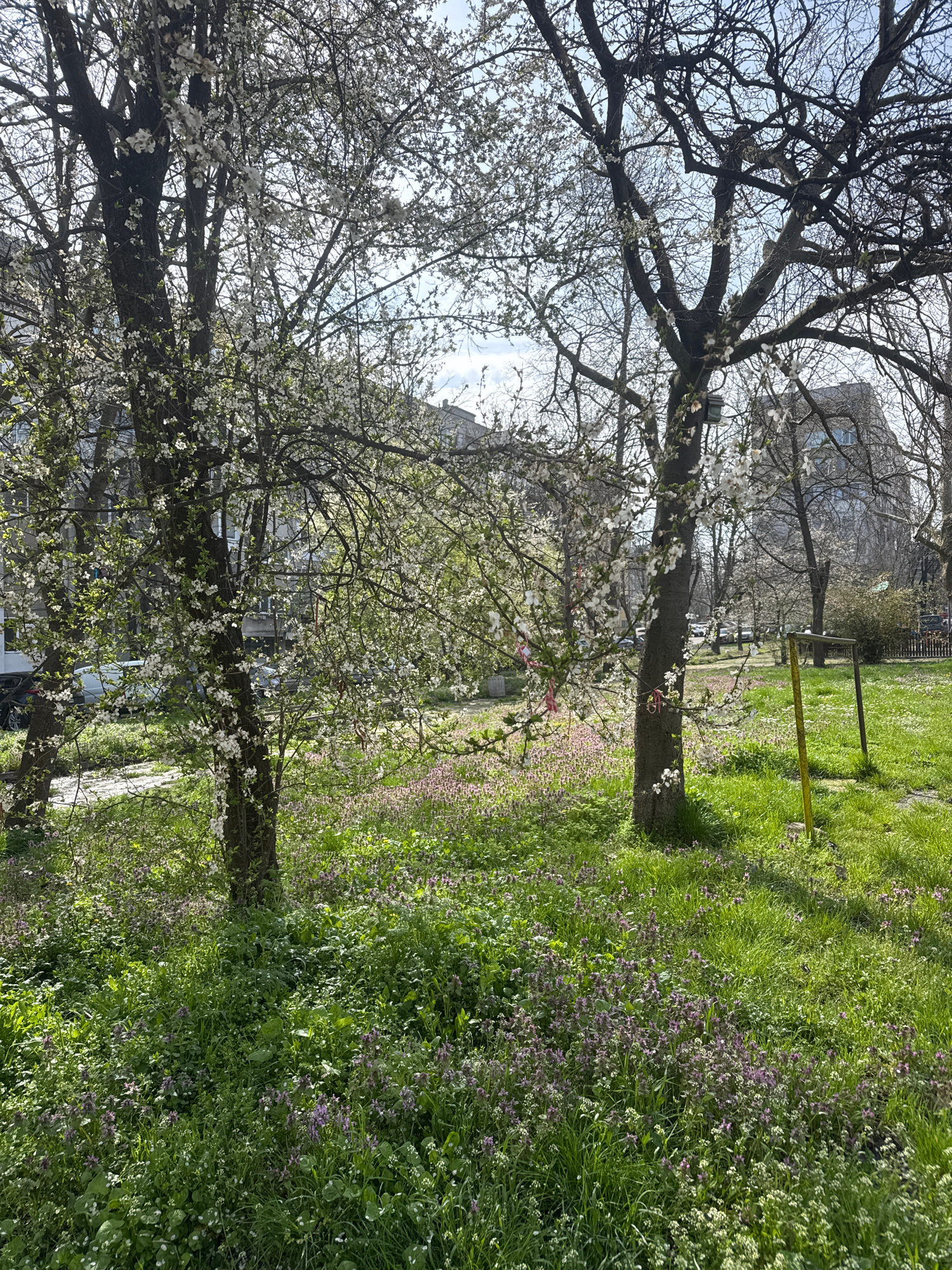 The image shows a park landscape in Burgas, Bulgaria. Two trees with white blossoms dominate the foreground, their branches partially obscuring a multi-story building in the background. The ground is…read more