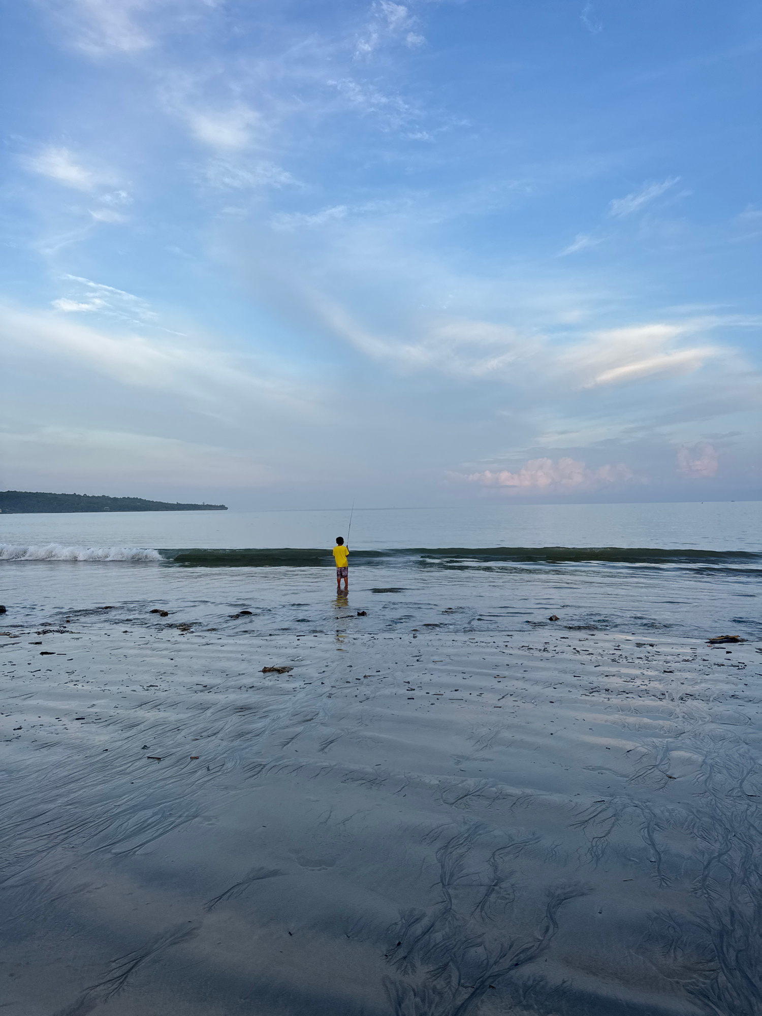 A vertical eye-level shot of Jimbaran beach, Indonesia, shows a person fishing in shallow water, facing the sea. The sky is blue with streaks of white clouds. The beach slopes gently down to the sea w…read more