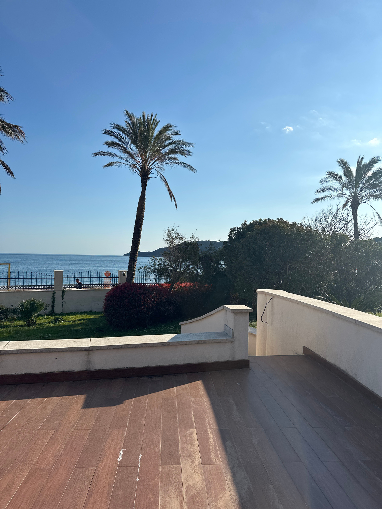 The image shows a view from a balcony in Boreti, Montenegro, overlooking the Adriatic Sea. A wooden-planked balcony is partially visible on the right side. A white, stuccoed wall with a curved top bor…read more