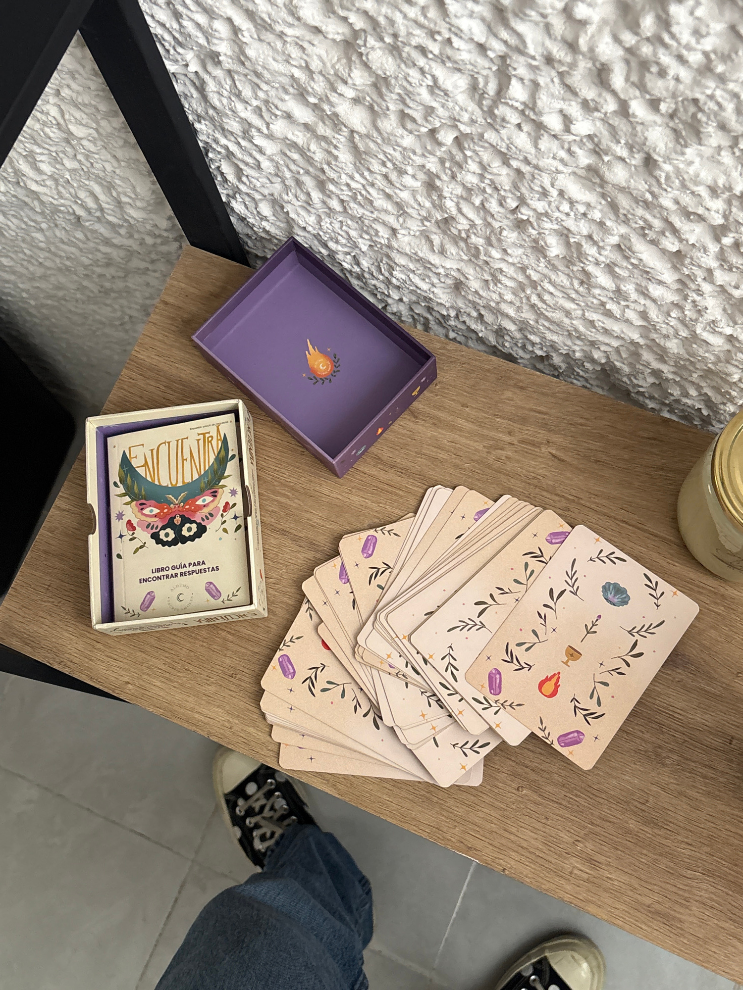 The image shows a tabletop scene with tarot cards, a purple box with a gold emblem, and a guidebook in a box with the Spanish word "ENCUENTRA." The tarot cards are spread out next to the box, which ap…read more