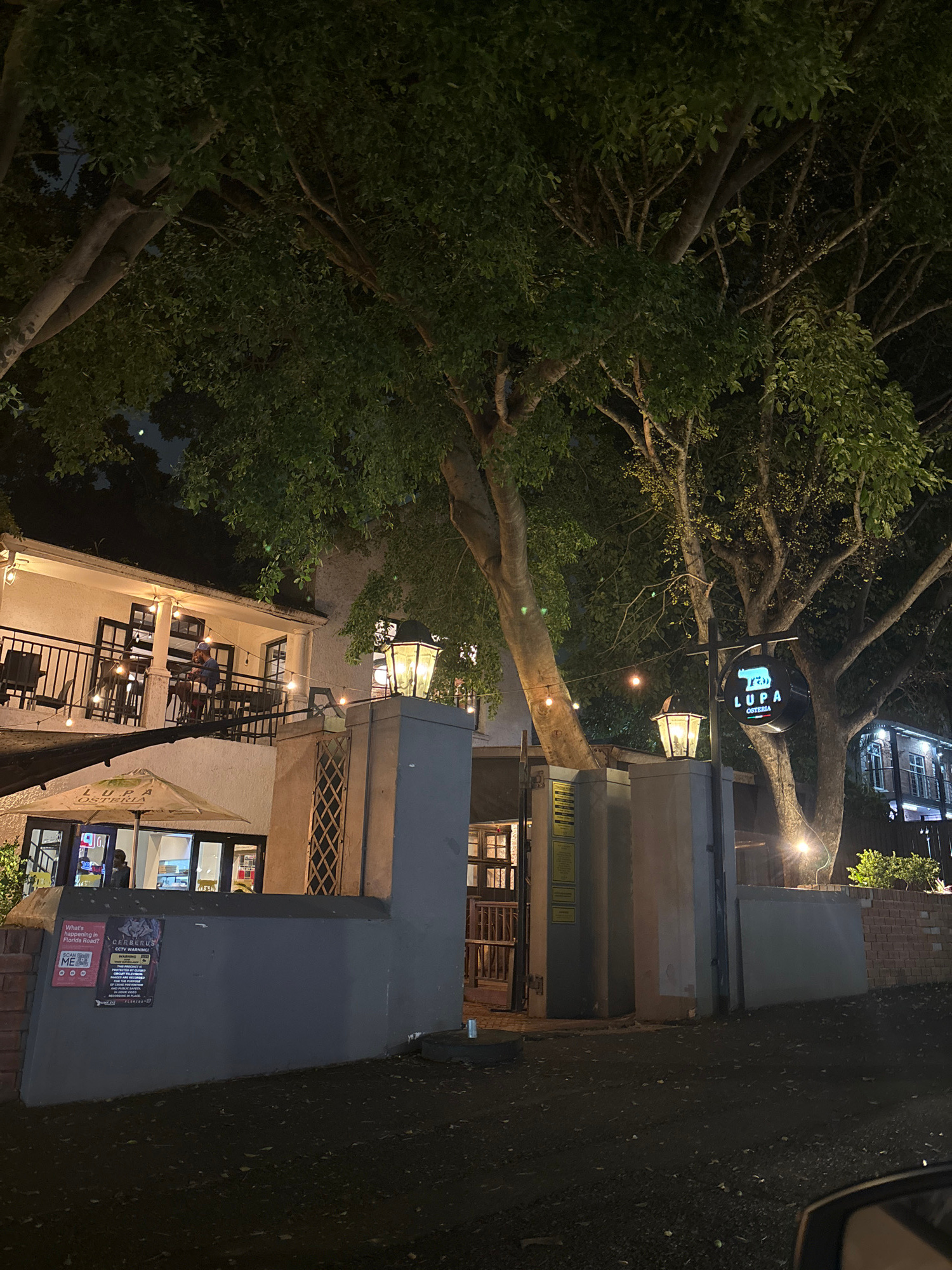 The image shows an outdoor view at night. A large tree with dense foliage dominates the left side of the frame. Its branches reach towards the right, partially obscuring a multi-story building. A sign…read more