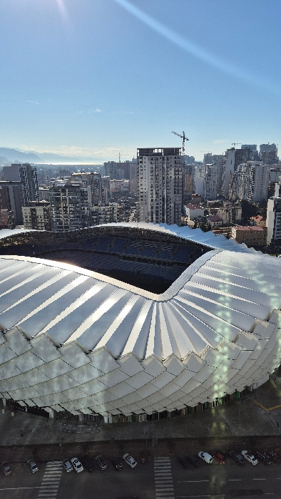 This image presents an elevated view of the Batumi Arena (Adjarabet Arena) in Batumi, Georgia, situated within a dense urban landscape under a clear, bright blue sky. The modern stadium occupies the f…read more