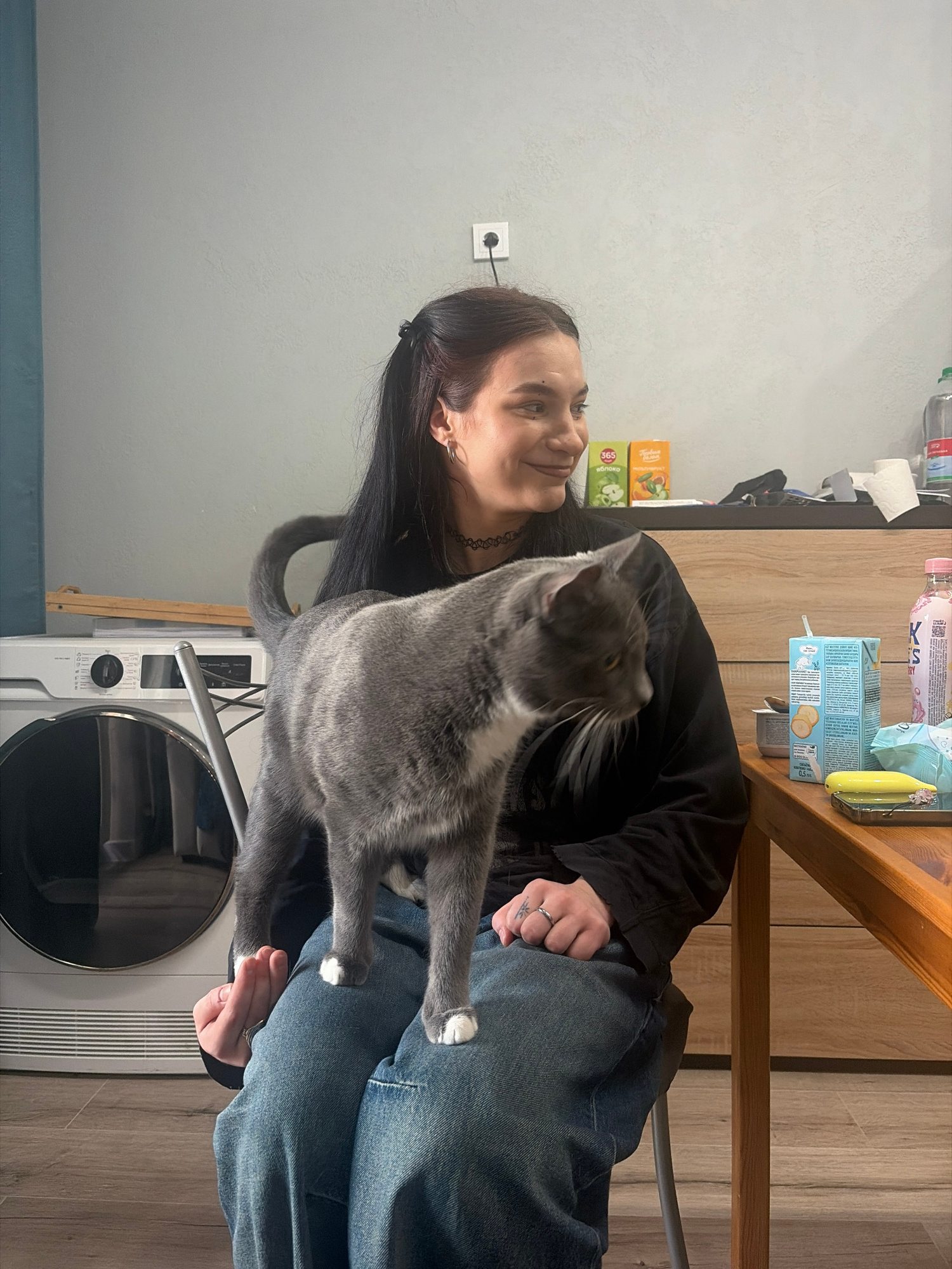 A woman with long dark hair sits in an indoor setting, wearing a black shirt and blue jeans. A gray cat is perched on her lap, mid-movement. A washing machine is visible in the background. The scene i…read more