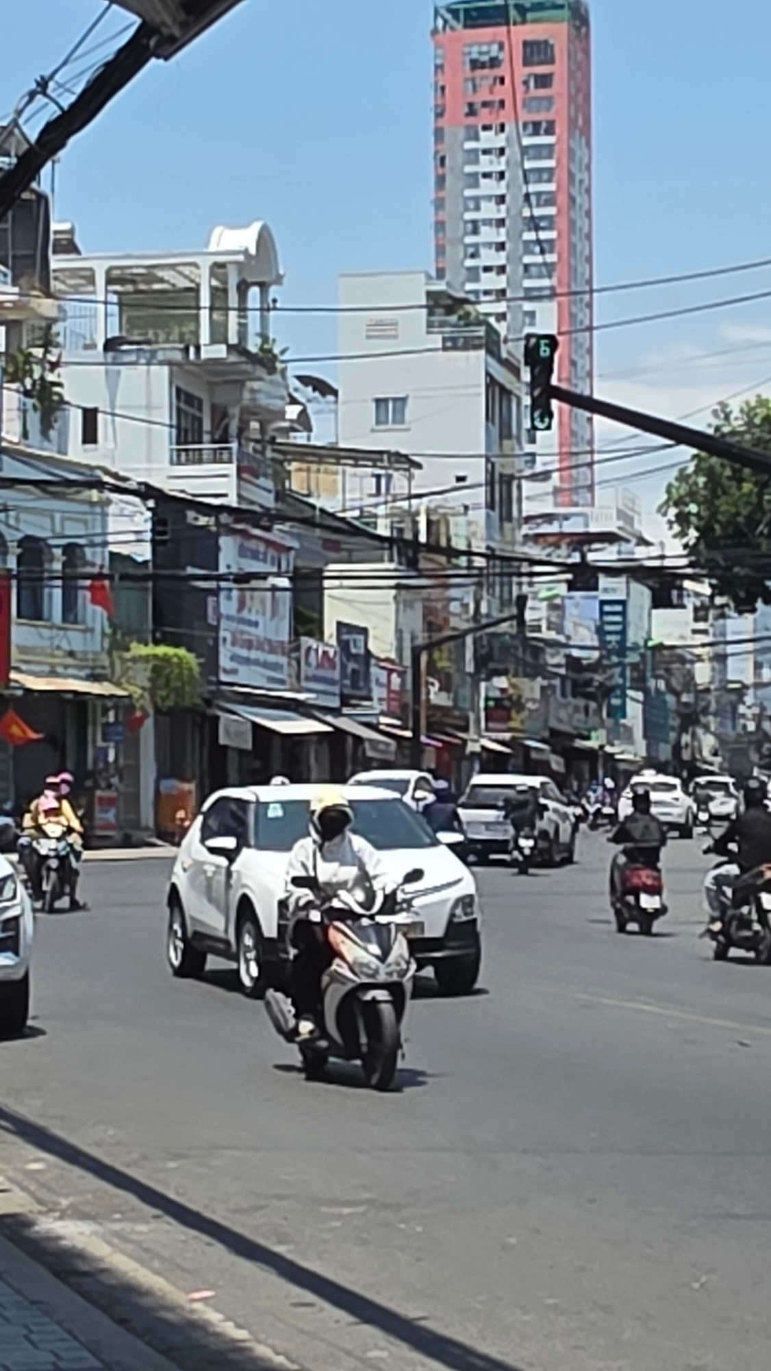 The image shows a street scene in Nha Trang, Vietnam, characterized by heavy motorbike traffic. Cars and motorbikes fill the roadway. Buildings of varying heights line the street, some displaying sign…read more