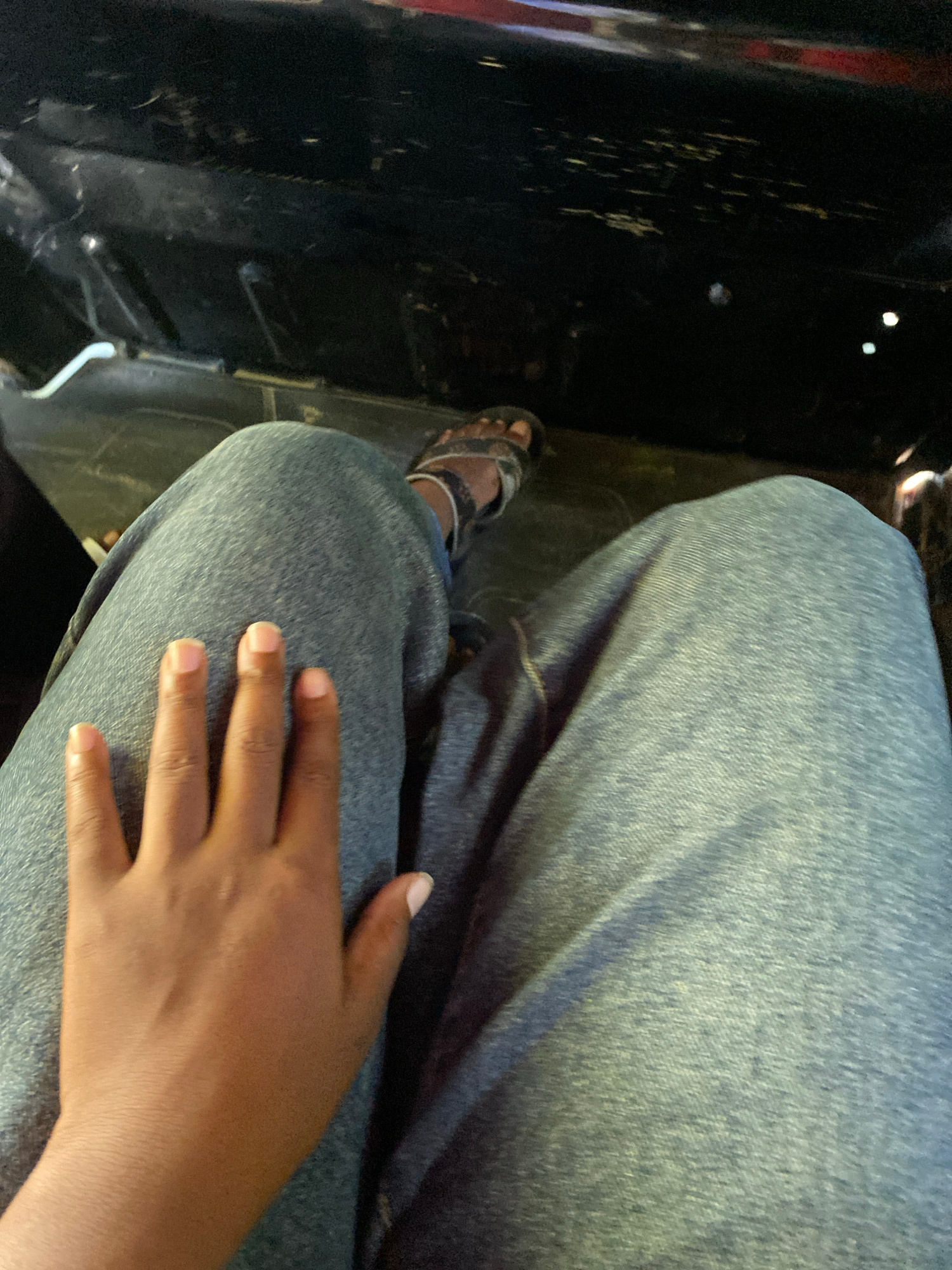 The image is a high-angle shot of a person sitting, wearing denim jeans and brown sandals. The person's hand rests on their leg. To the left, there is a dark, possibly textured surface, which could be…read more