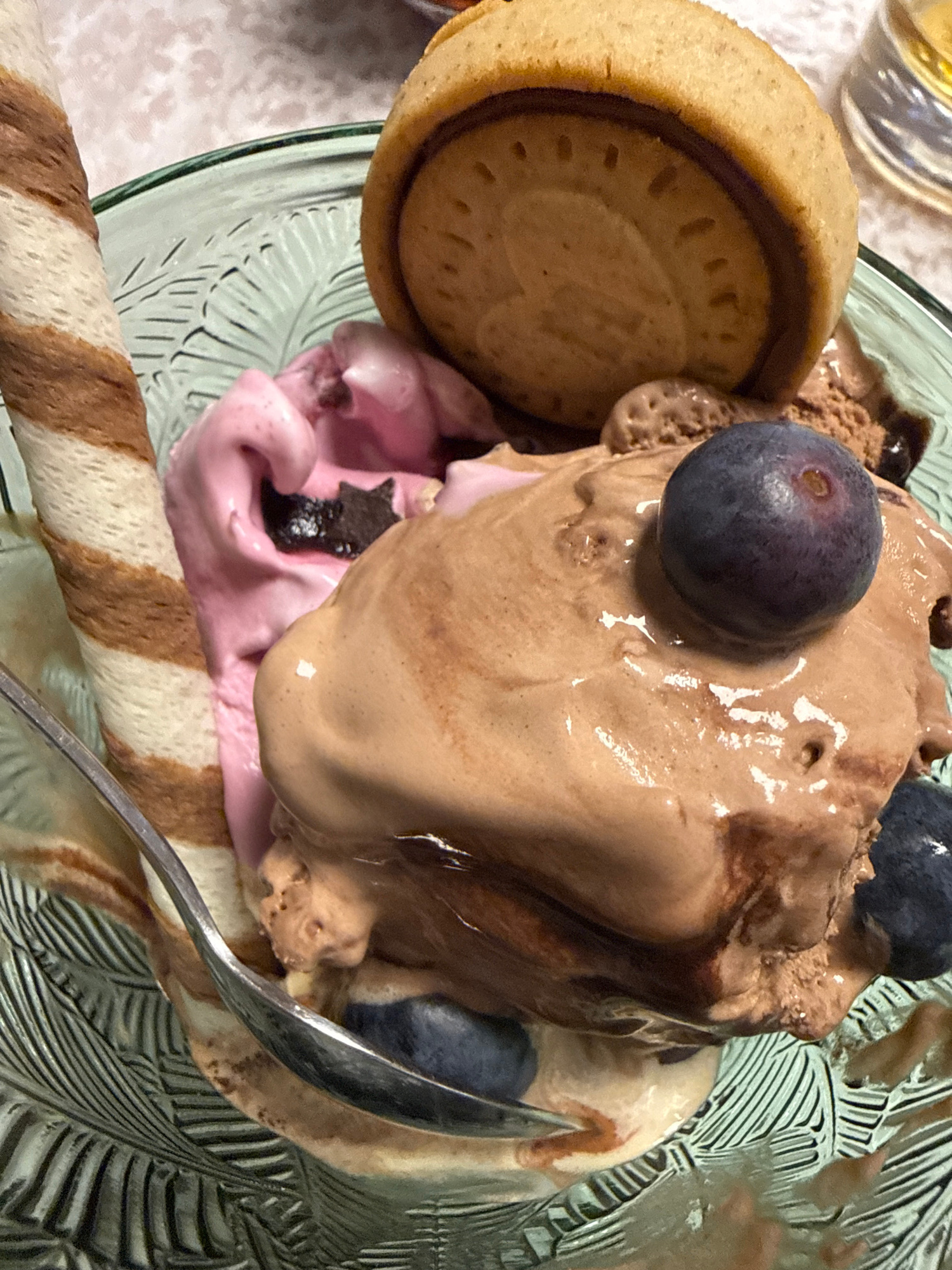 A close-up overhead shot shows an ice cream sundae in a green glass dish. The sundae features scoops of chocolate and strawberry ice cream, garnished with two blueberries atop the chocolate scoop. A c…read more