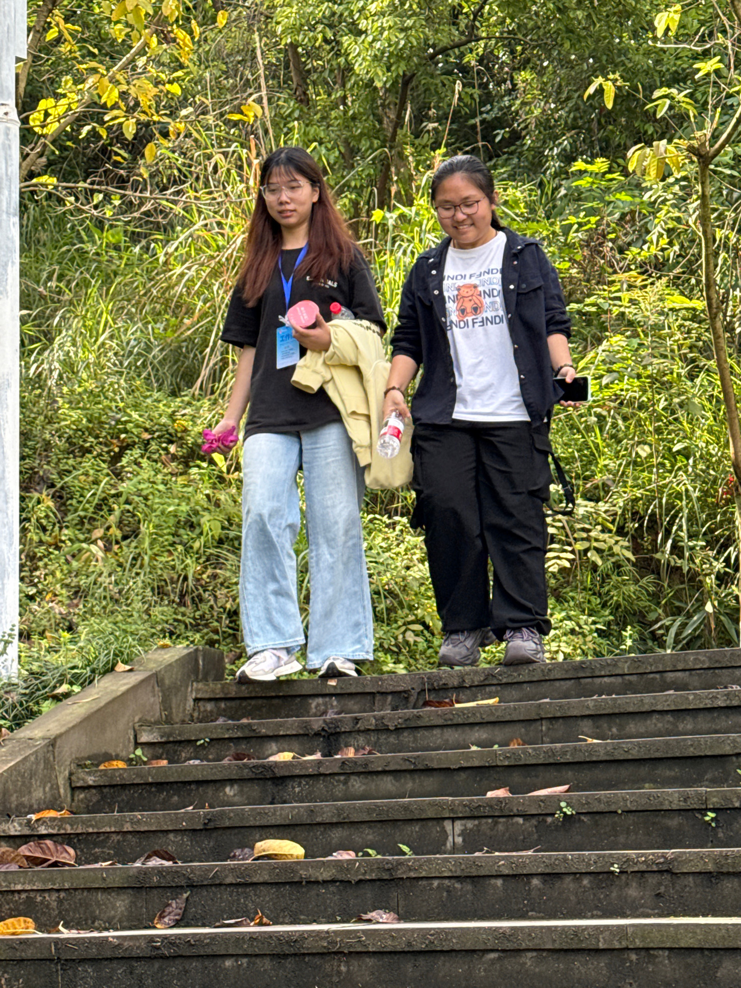 Two young women stand on the side of a concrete staircase in a natural setting. The first woman, closer to the top of the stairs, wears glasses, a white t-shirt with Fendi branding, a black jacket, an…read more