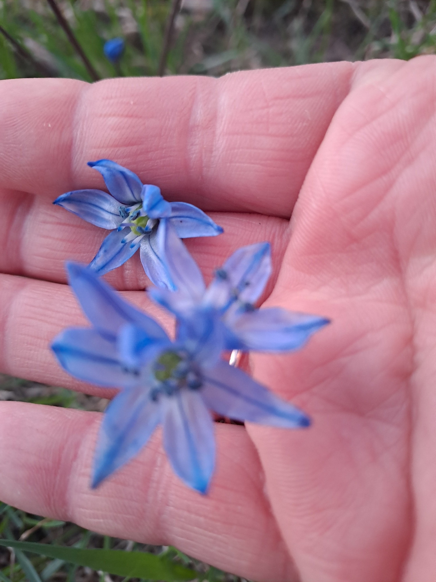 A close-up shot focuses on two small, vibrant blue flowers held in the palm of a human hand. The flowers each have six petals. The hand, displaying fine lines and skin texture, takes up a significant…read more