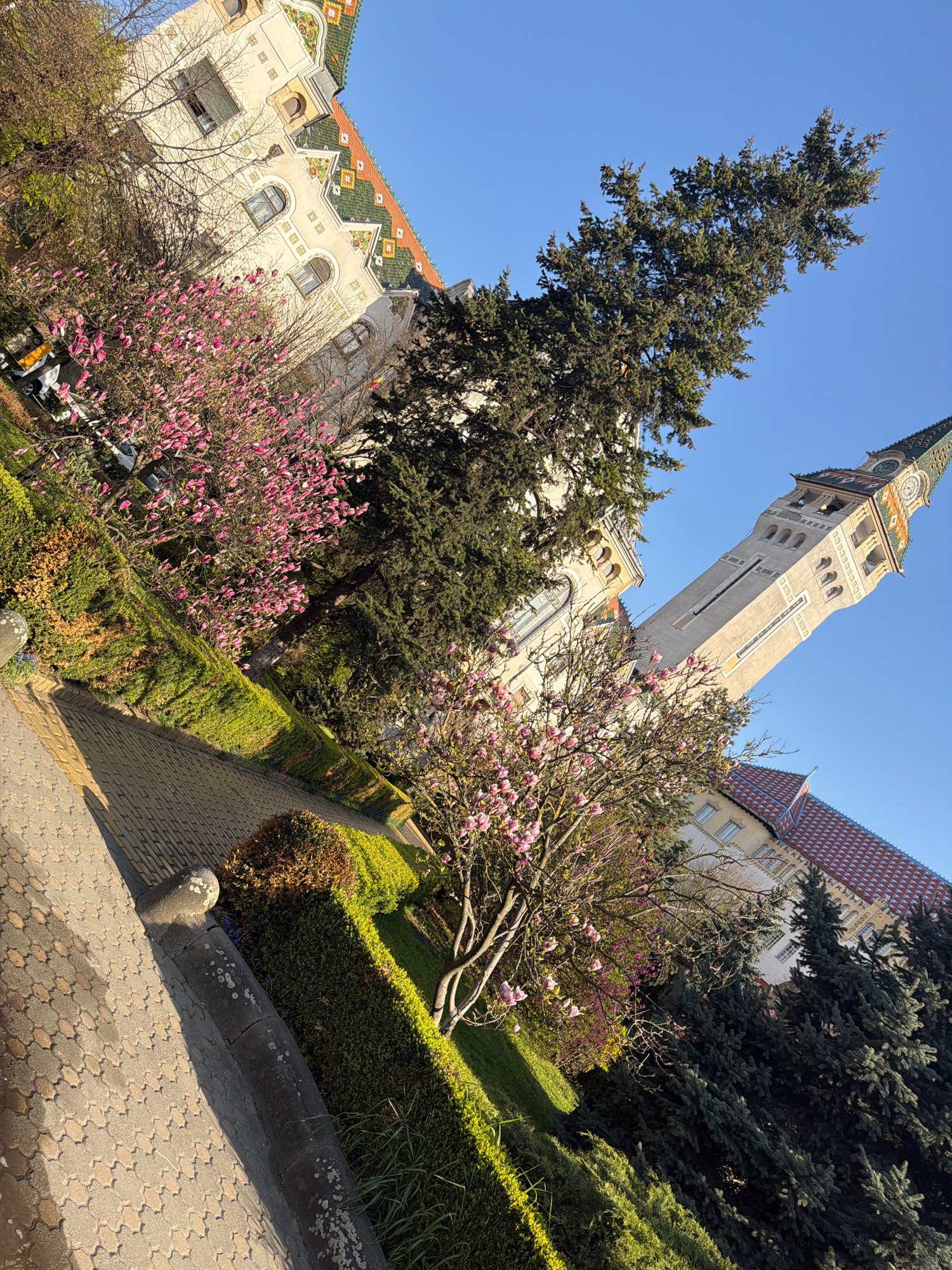 The image depicts a view of the Târgu Mureș City Hall in Târgu Mureș, Romania, from a ground-level perspective. The imposing tower of the City Hall dominates the scene, rising diagonally across the frame. Its architectural details, including windows and the clock at the top, are visible. The City Hall building itself, featuring a tiled roof and ornate facade, is partially visible. Lush greenery surrounds the building, including trees, bushes, and hedges. Pink flowering trees are prominently featured in the foreground. A paved pathway leads into the scene, its surface textured with an interlocking pattern. The sky is clear and blue. | Open Wire