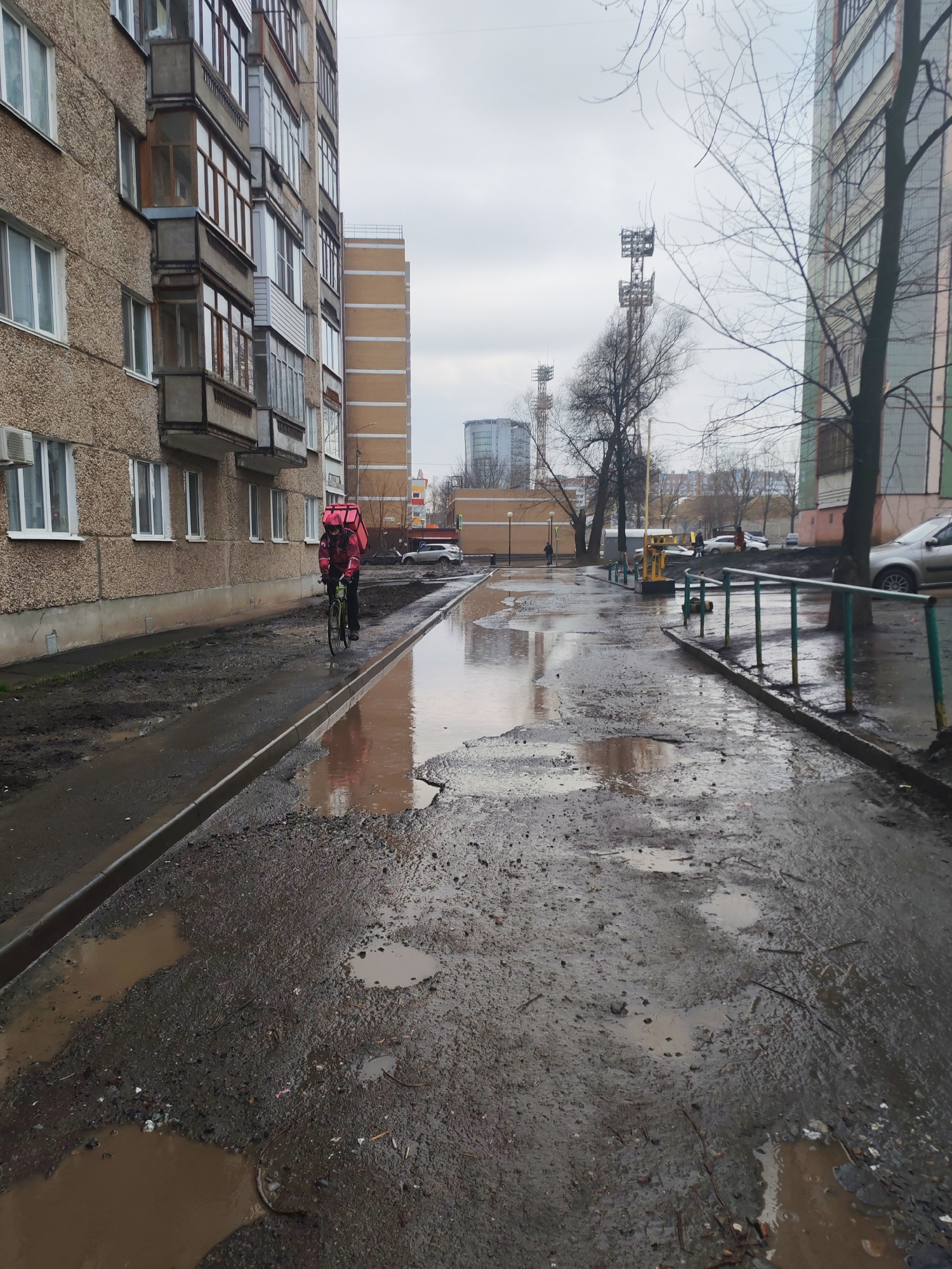 The image shows a street in Izhevsk, Russia, heavily damaged with potholes filled with muddy water. On the left, a multi-story apartment building with weathered beige concrete panels is visible. A cyc…read more