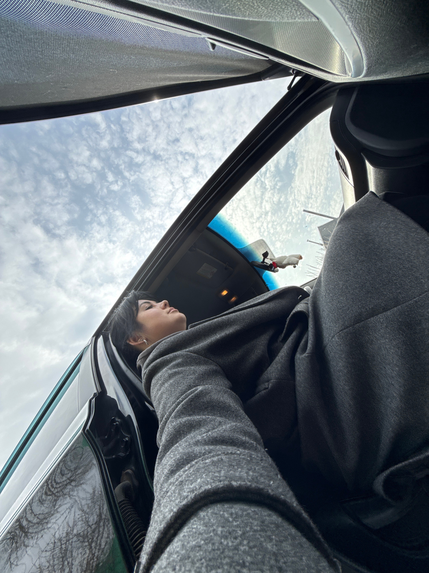 A low-angle view looking up through the open sunroof of a vehicle. A person wearing a gray hooded garment is partially visible, leaning into the sunroof opening. The sky is visible through the sunroof…read more