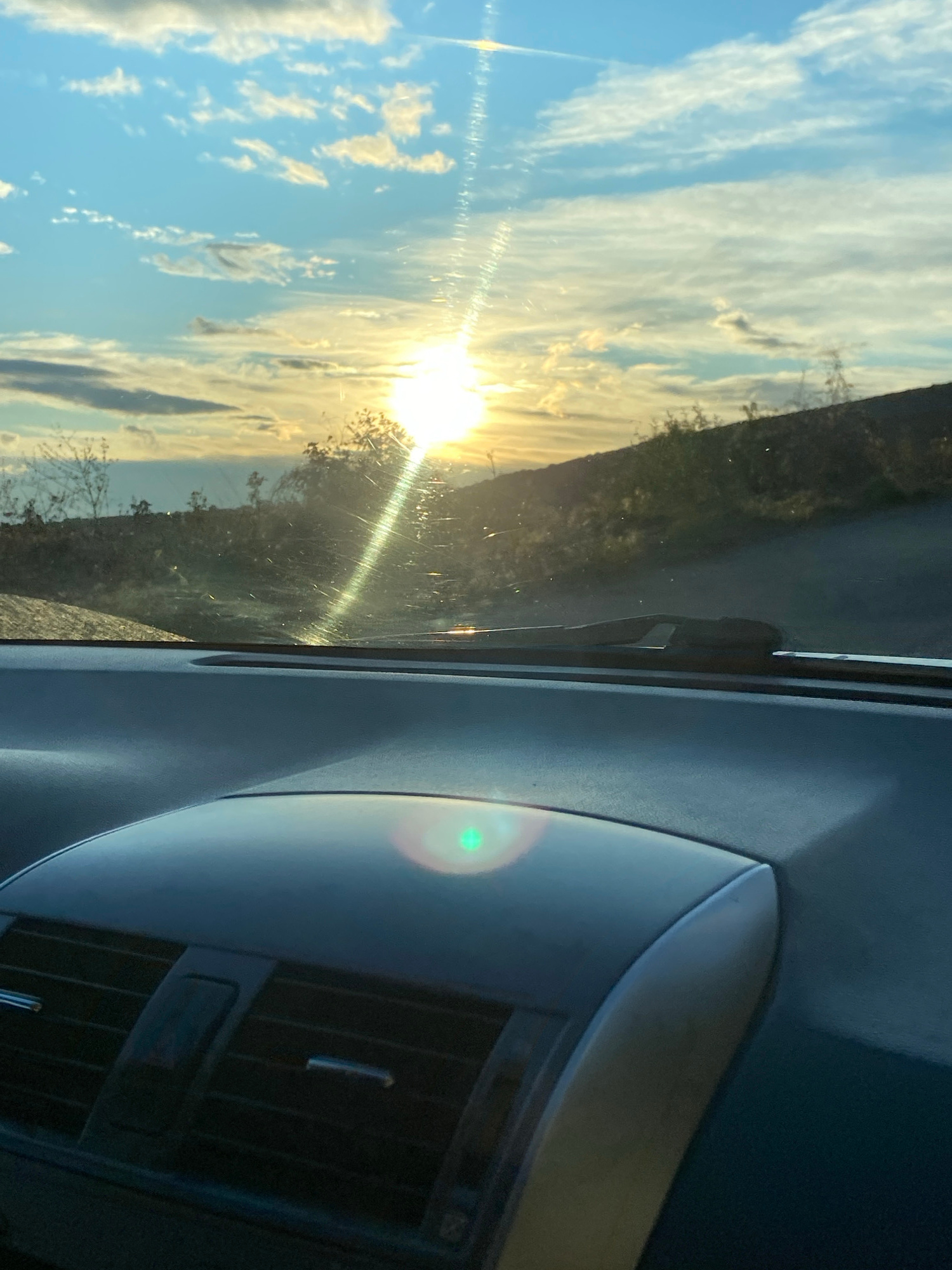 The image depicts a view from inside a vehicle, likely a car, looking out through the windshield. The sun is low on the horizon, obscured by scattered trees and vegetation, causing a glare. Above, the…read more