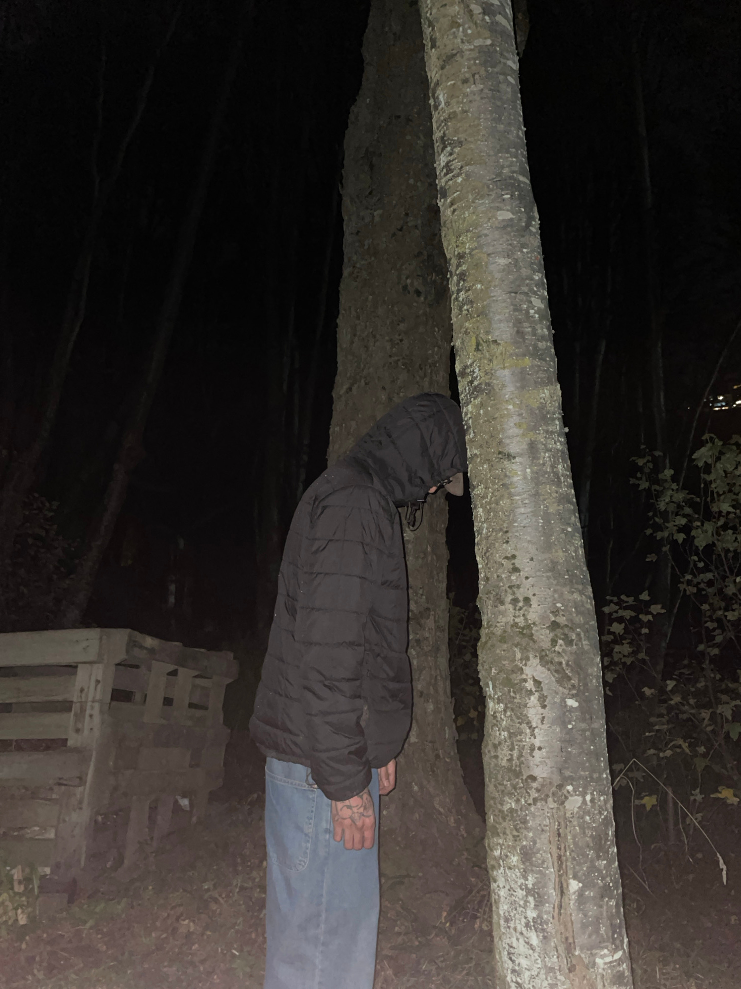 A person wearing a dark hooded jacket and jeans lies on top of a horizontal tree trunk. The person's hand is visible, revealing tattoos. Below the person and to the right, there is a weathered woodenβ¦read more