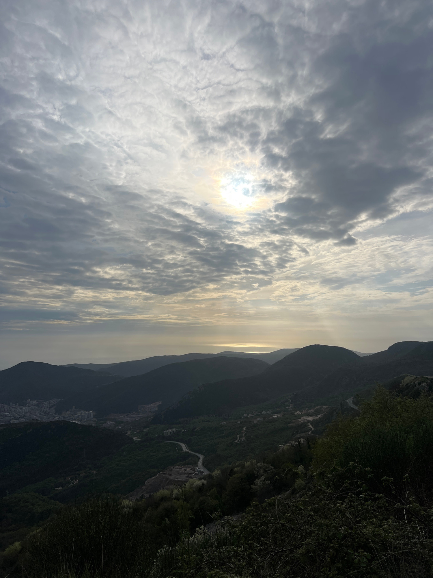 The image presents a landscape view from an elevated position in Brajici, Montenegro. The sky dominates the left side of the frame with a mix of dense, grey clouds partially obscuring the sun, creatinβ¦read more
