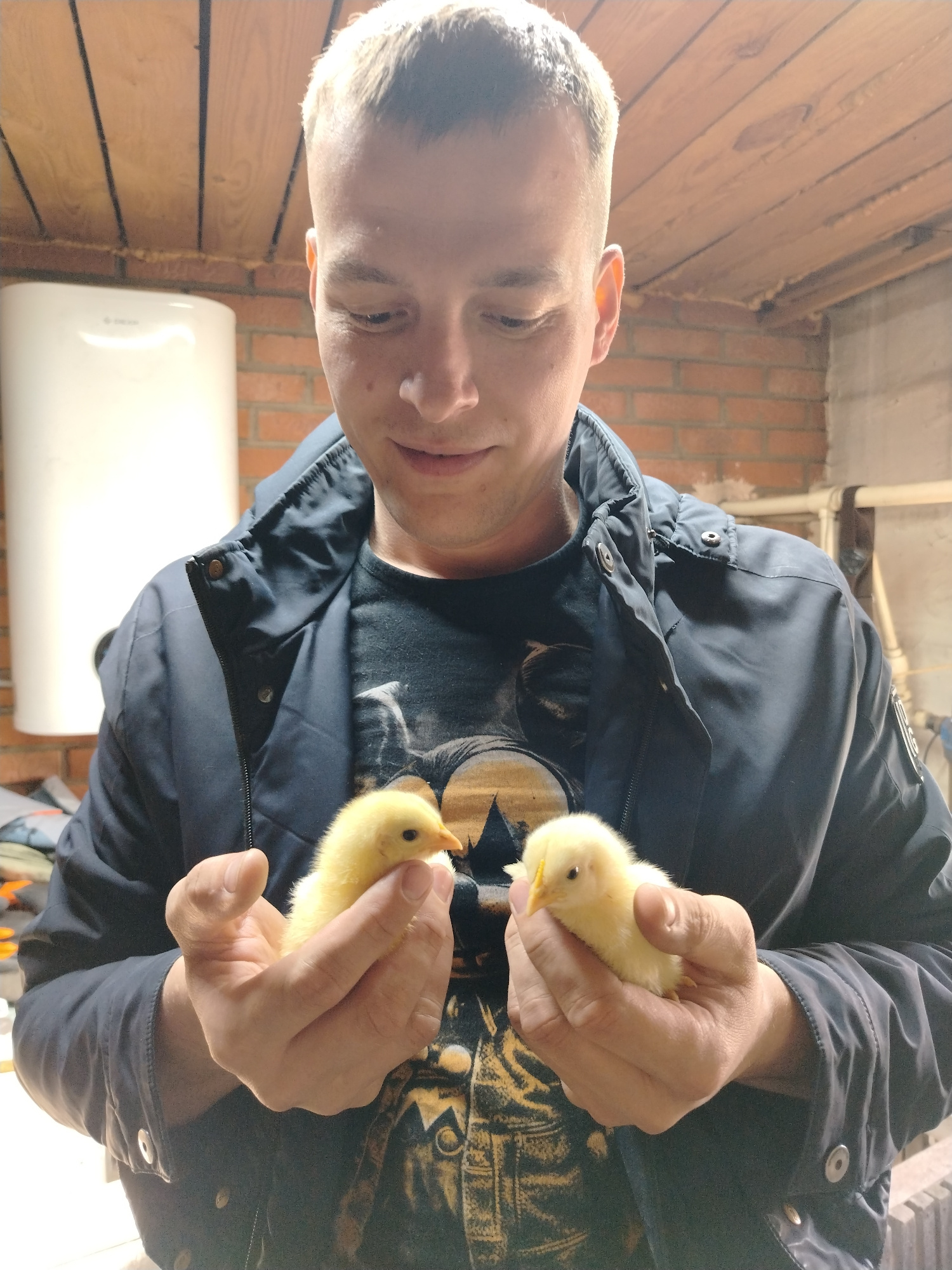 A fair-skinned man with short blond hair is holding two yellow chicks in his hands. He is wearing a dark blue jacket over a t-shirt with a graphic print. The background includes exposed brick, a white water heater, and a wood-paneled ceiling. The location is Nizhnyaya Gar', Russia. | Open Wire