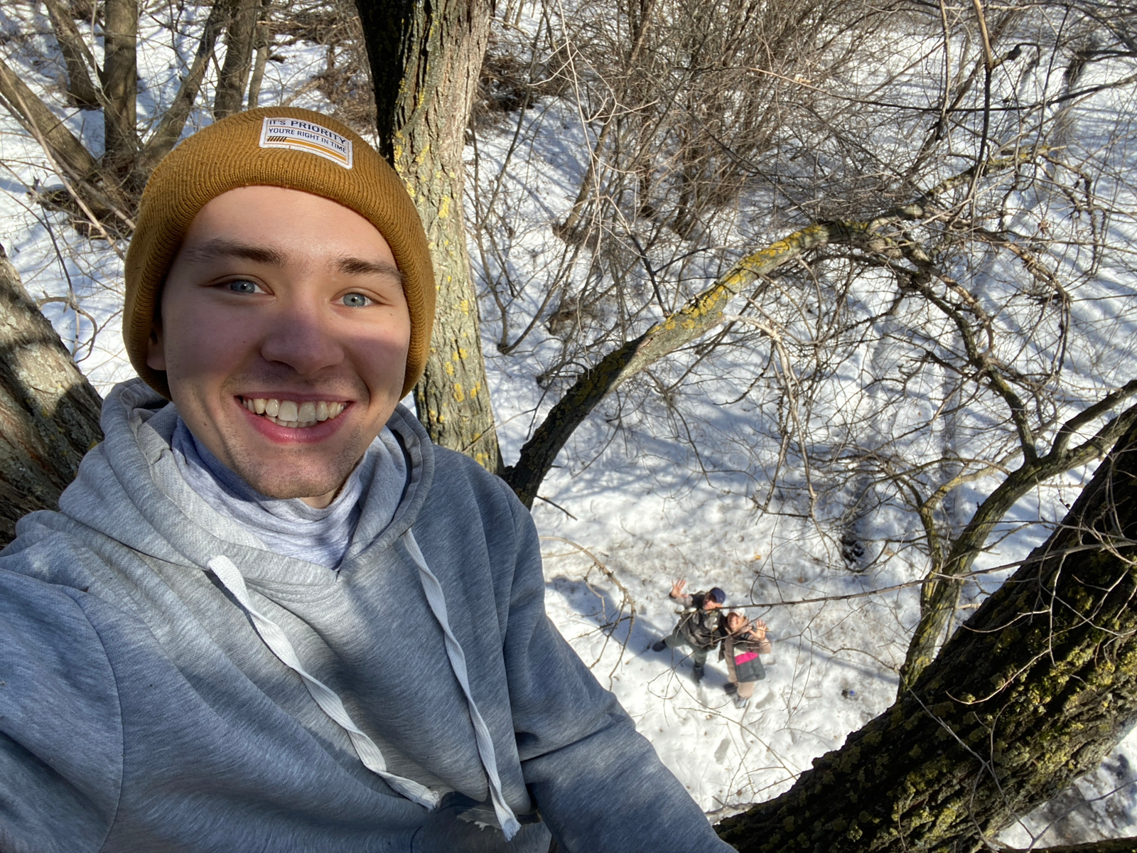 A person is perched in a tree, taking a selfie. The person is wearing a grey hoodie and a tan beanie with a patch. The scene below shows a snowy landscape with bare trees and branches. There are two i…read more