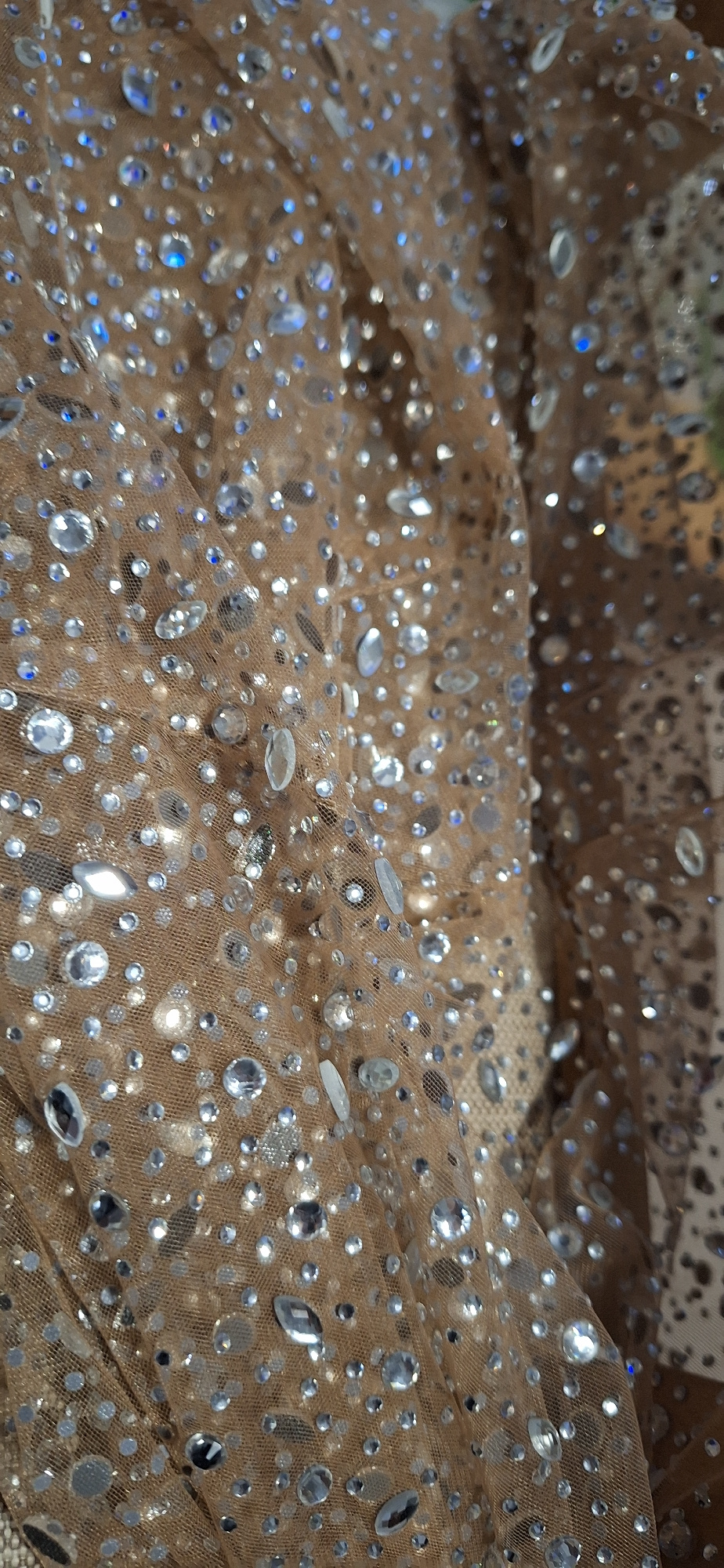 The image shows a close-up view of a sheer, beige fabric embellished with numerous clear, iridescent crystals or rhinestones of varying shapes and sizes. The fabric is draped and folded, creating dept…read more
