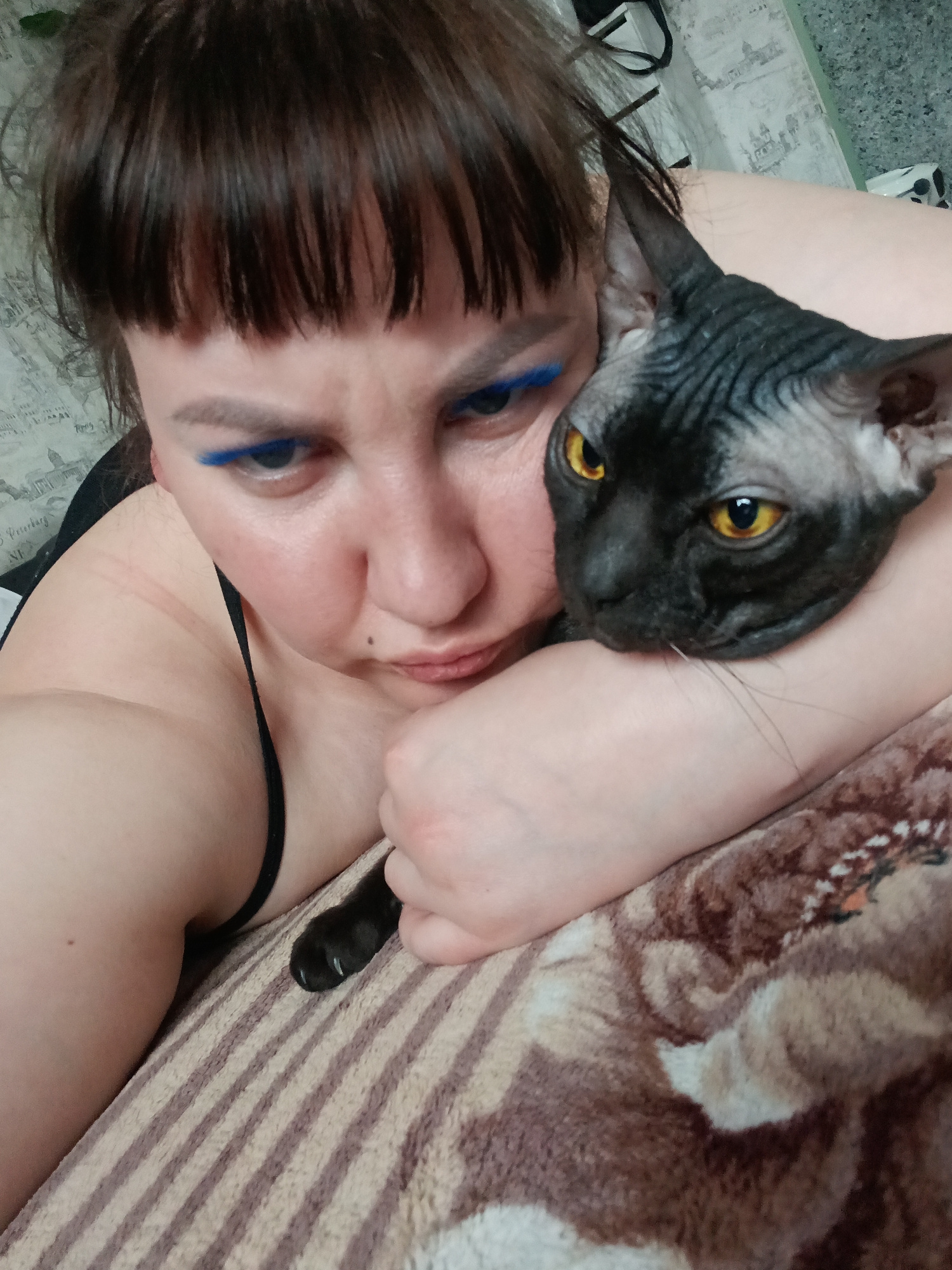 A woman with dark hair and blue eyeliner is lying on a striped blanket. A black and grey cat rests on her arm. The environment includes a patterned blanket and what appears to be wallpaper. The precis…read more