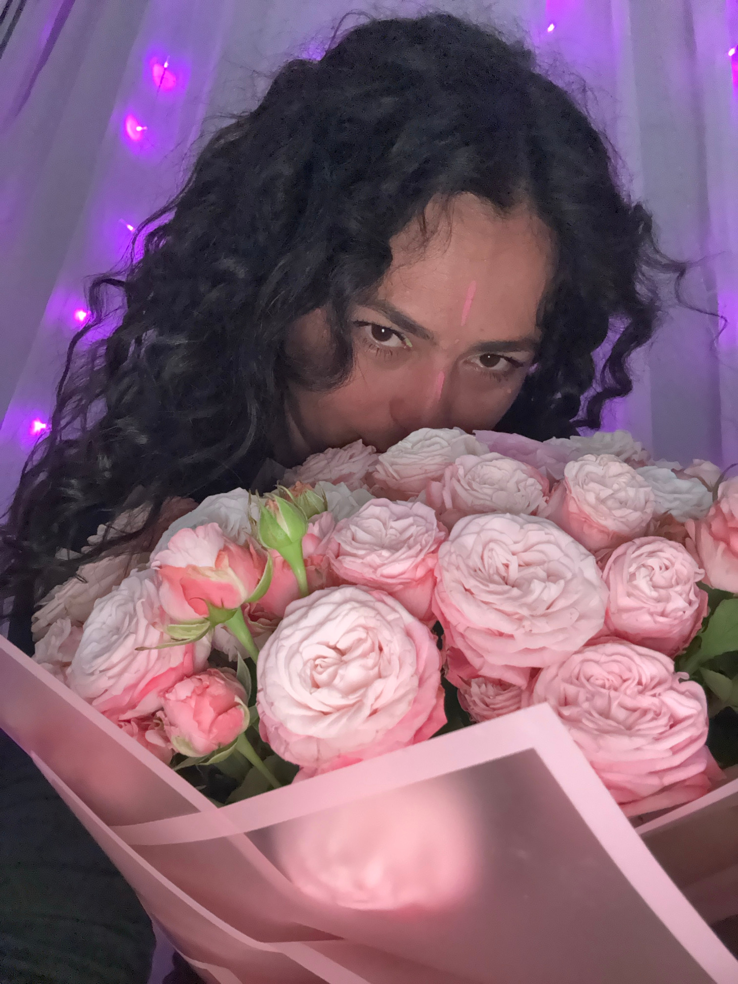 A close-up, slightly angled shot features a person holding a bouquet of light pink roses. The person has dark, curly hair covering part of their face, with their eyes visible. There is a pink line on…read more