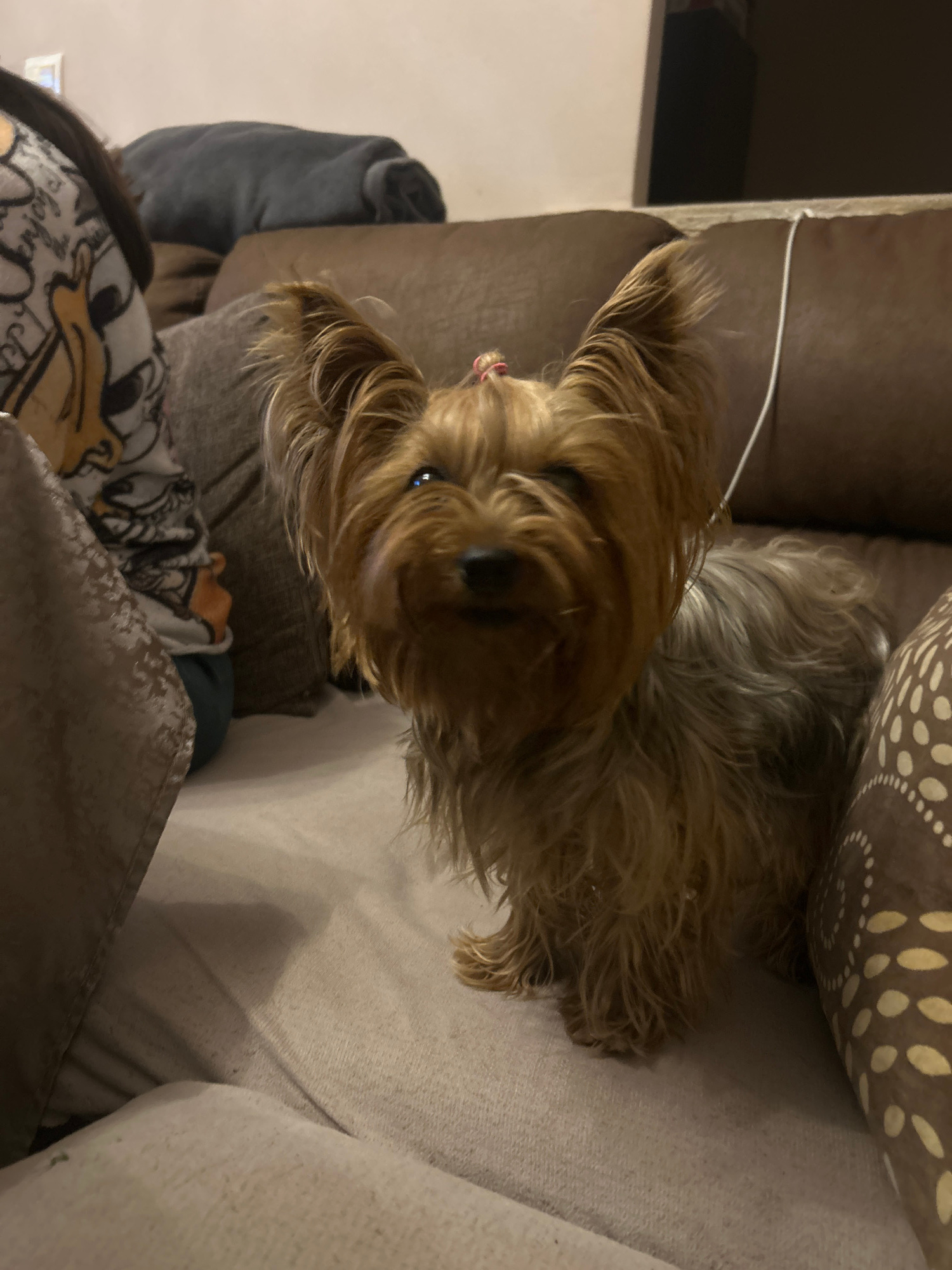 A tan and grey Yorkshire Terrier is lying on a brown and beige patterned couch. The couch is a beige and brown colour. Part of a blanket with Donald Duck cartoon print can be seen. The location of the…read more