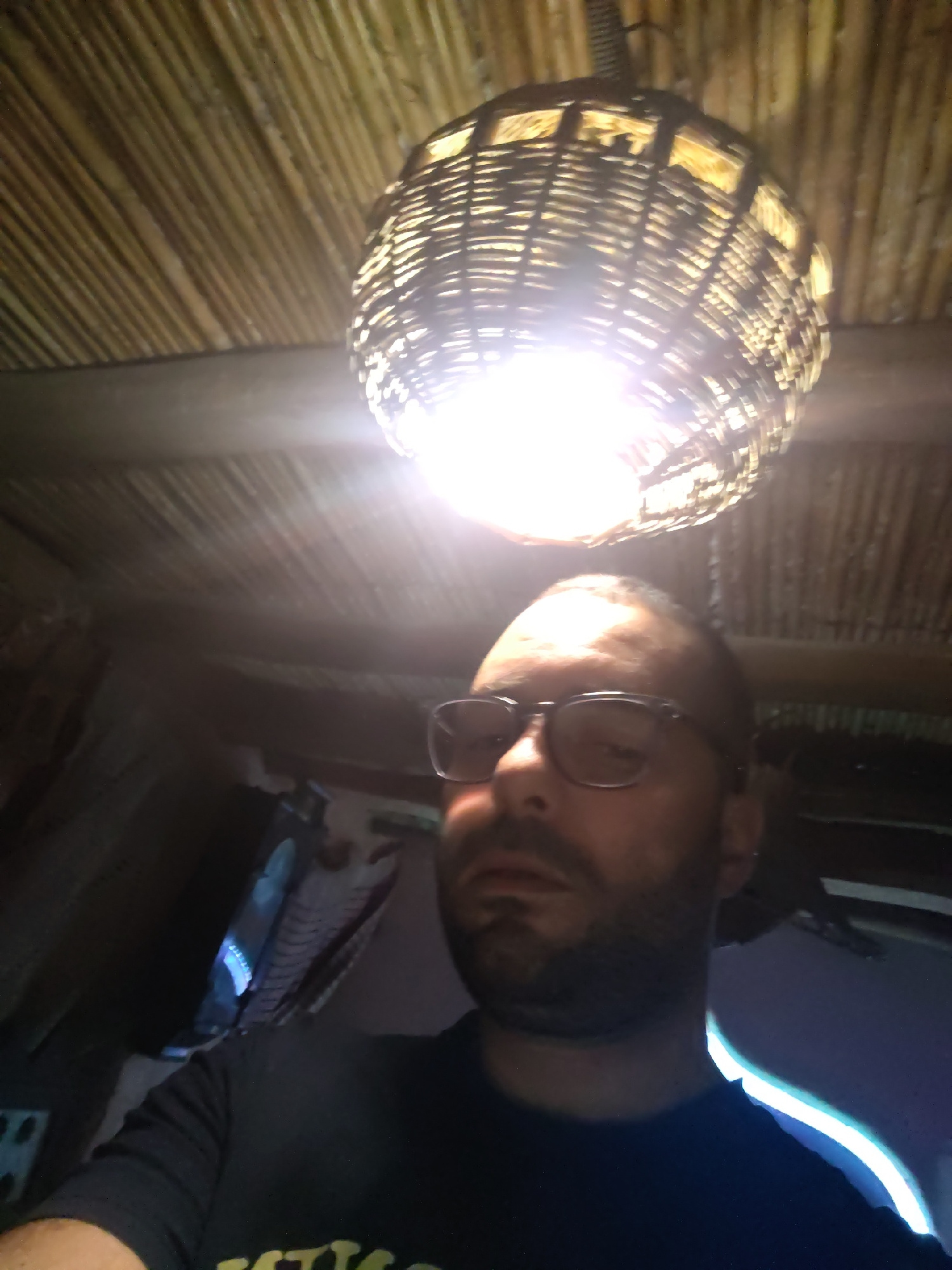 A man with glasses and a beard is in the foreground, wearing a dark T-shirt. Above him is a round, woven light fixture that is illuminated brightly. The ceiling appears to be made of bamboo or a simil…read more