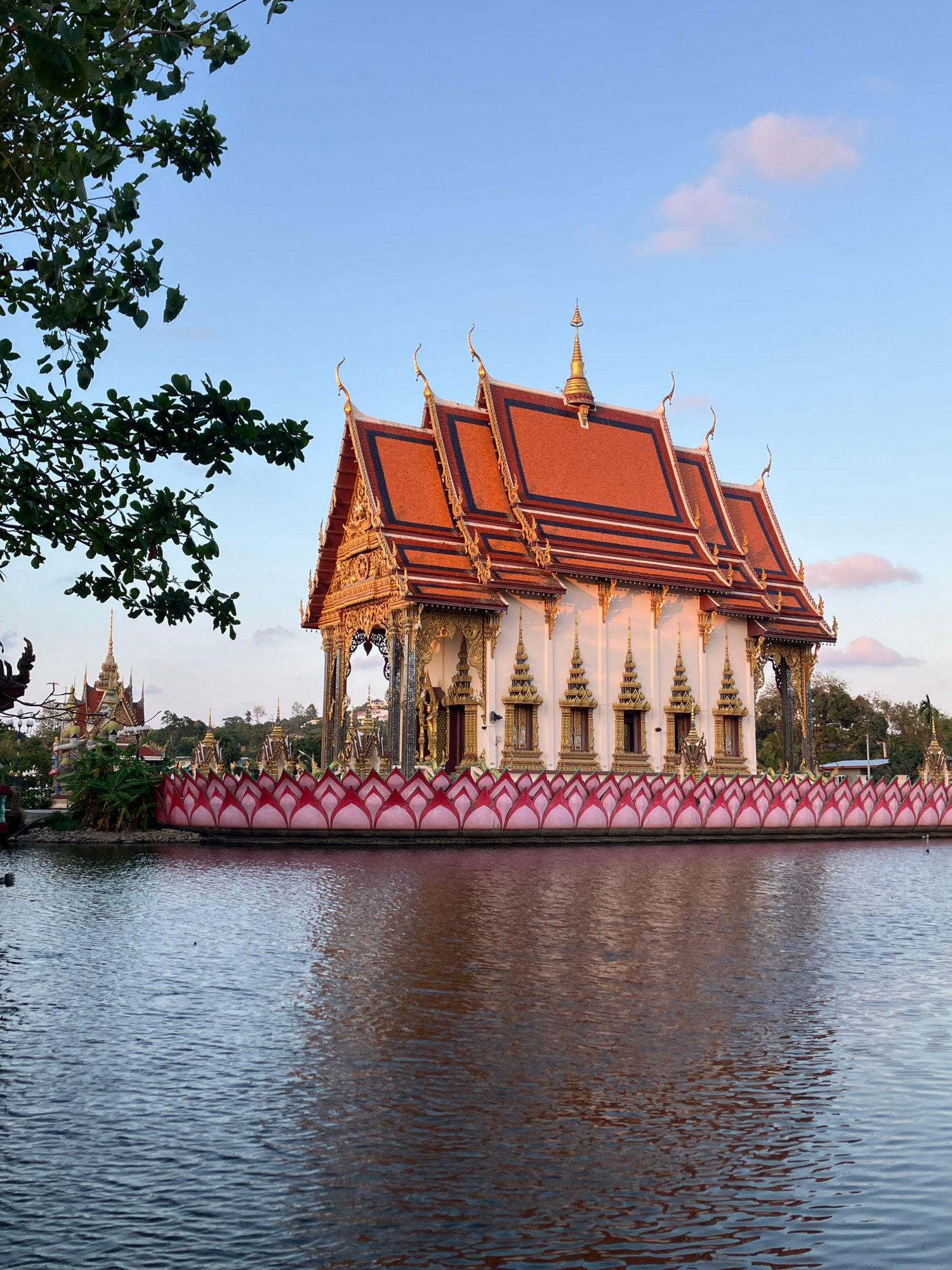 The image depicts Wat Plai Laem, a Buddhist temple complex located in Baan Plai Laem, Thailand. The temple is situated on a body of water, with a prominent building reflecting on the water's surface.…read more