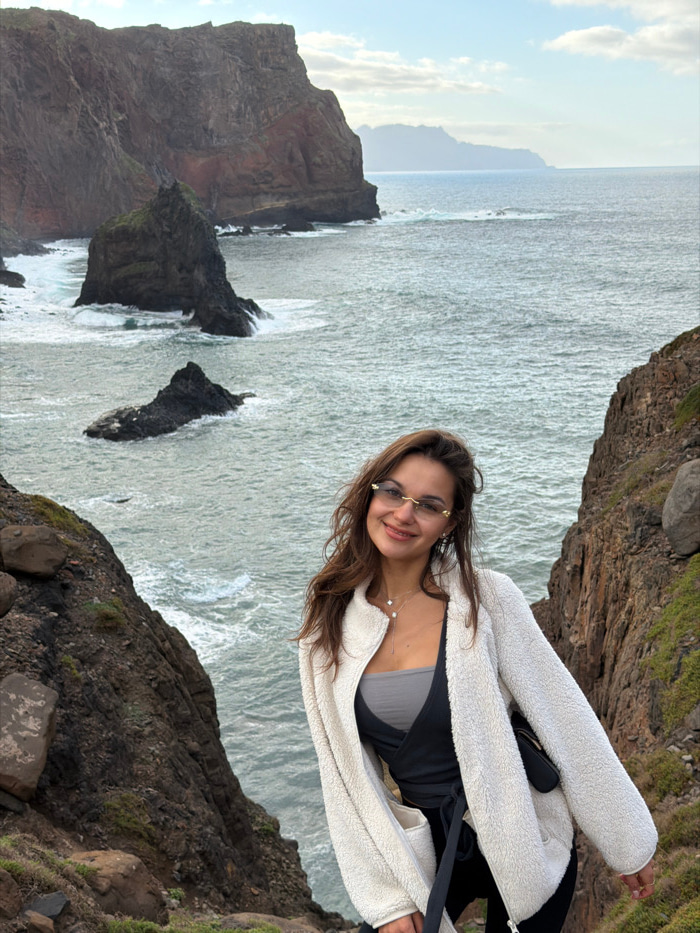 The image captures a young woman standing on a rocky cliff overlooking a dynamic coastal landscape. The woman, positioned on the right side of the frame, has long, flowing brown hair and is smiling wa…read more