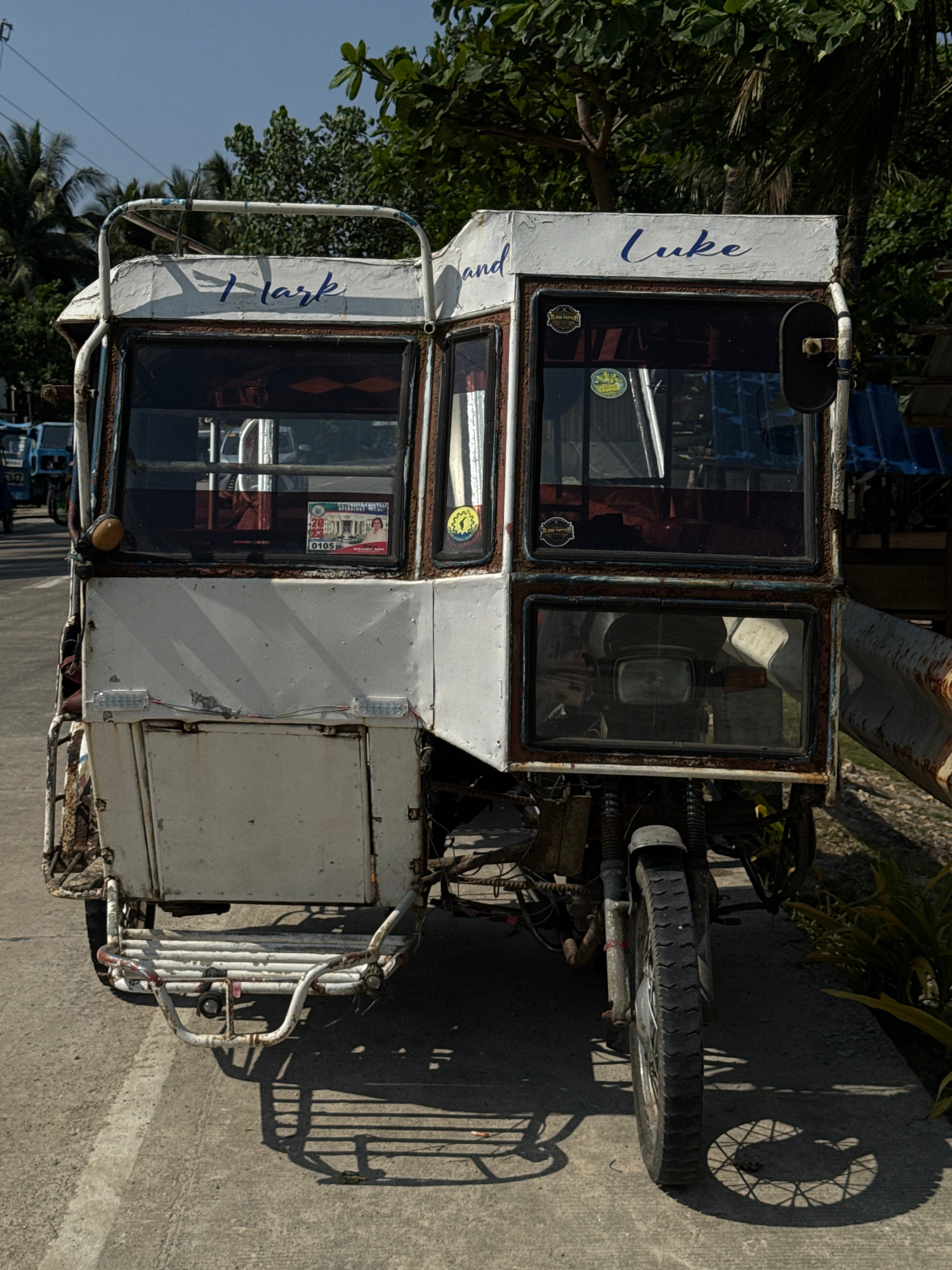 An eye-level, outdoor, daytime shot shows a motorized tricycle parked on a concrete surface. The vehicle, white and heavily rusted, is labeled "Luke" and "Mark" on the sides. The tricycle has a passen…read more