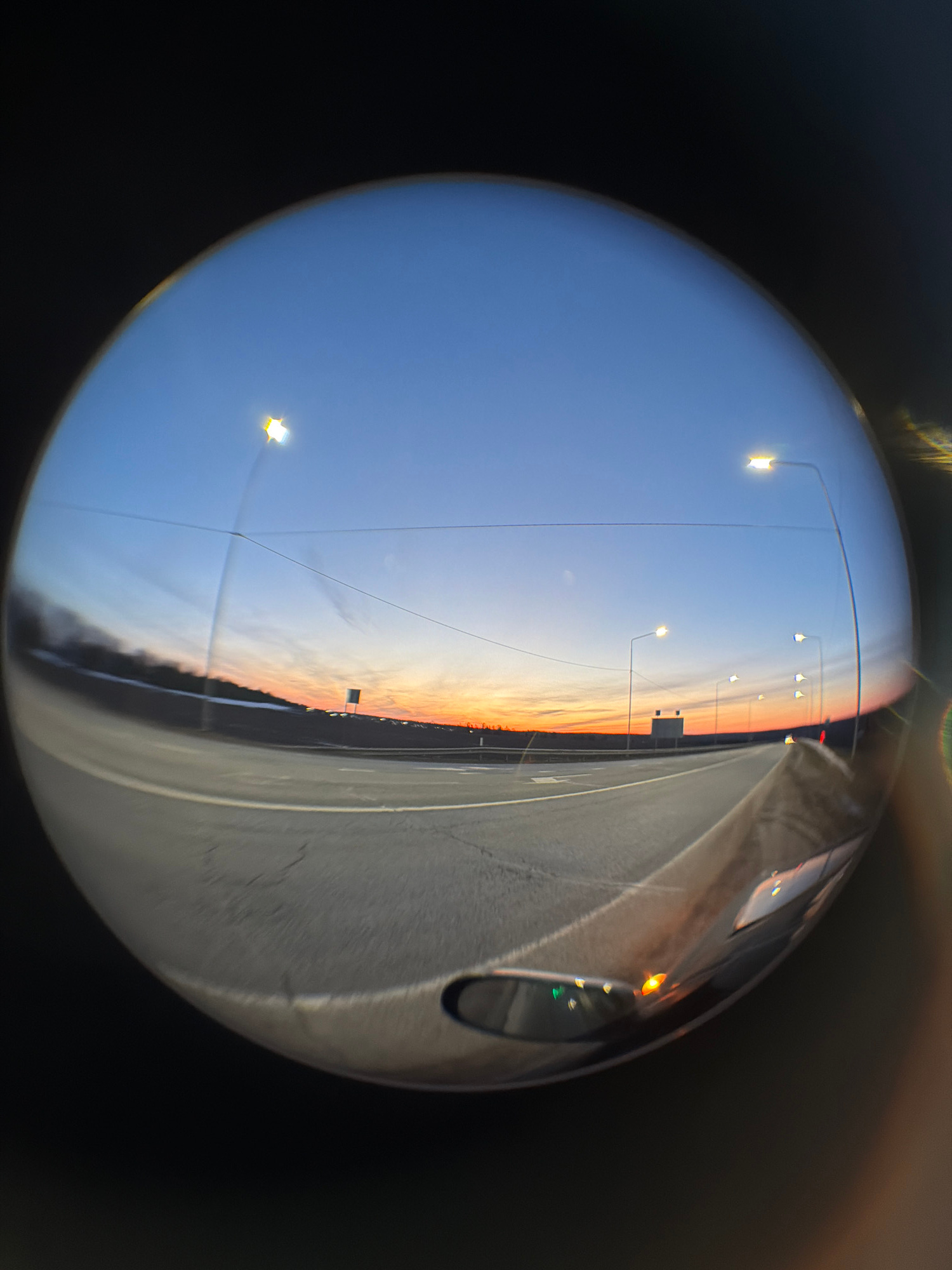 The image shows a fisheye view of a highway at sunset, likely reflected in a spherical object. The sky transitions from blue to orange near the horizon. A row of streetlights lines one side of the hig…read more