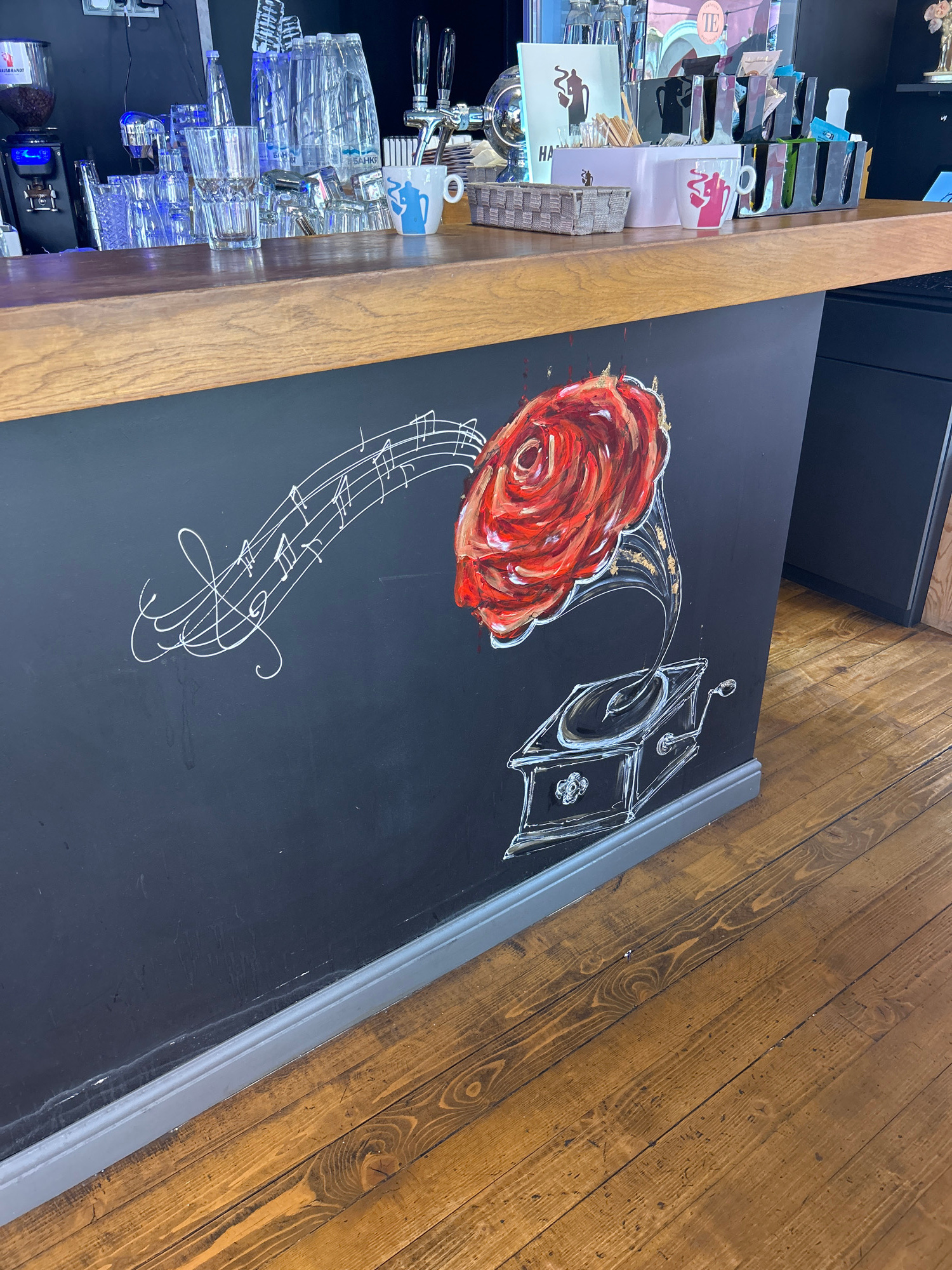 An indoor scene, likely a bar or café counter, is depicted from a slightly elevated angle. A warm-toned wooden counter runs diagonally from the lower left to the upper right. On the black, chalkboard…read more