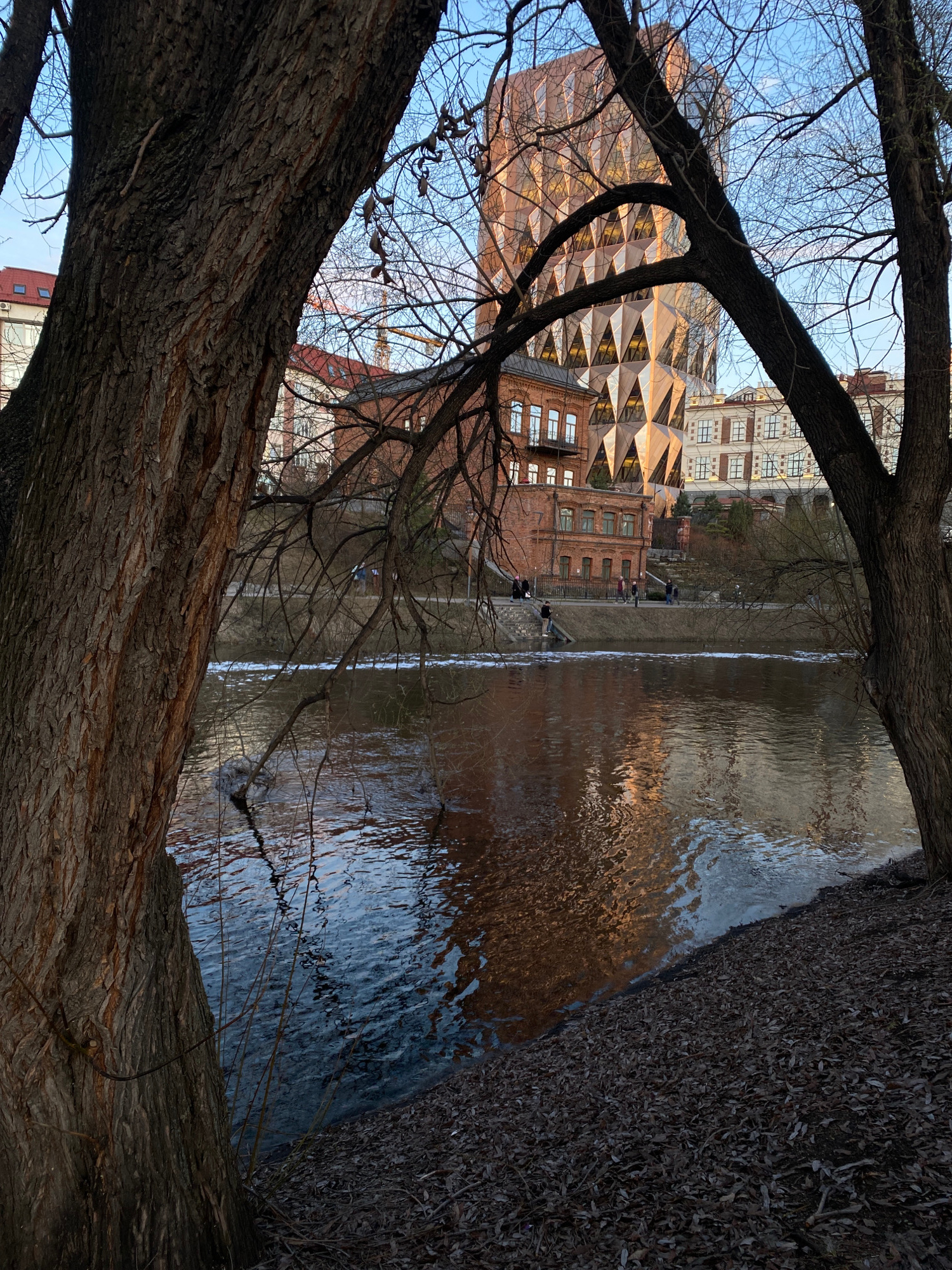 A landscape shot taken from a low vantage point through the branches of a large tree. The tree's thick trunk and bare branches dominate the foreground. In the midground is a canal or river, reflecting…read more