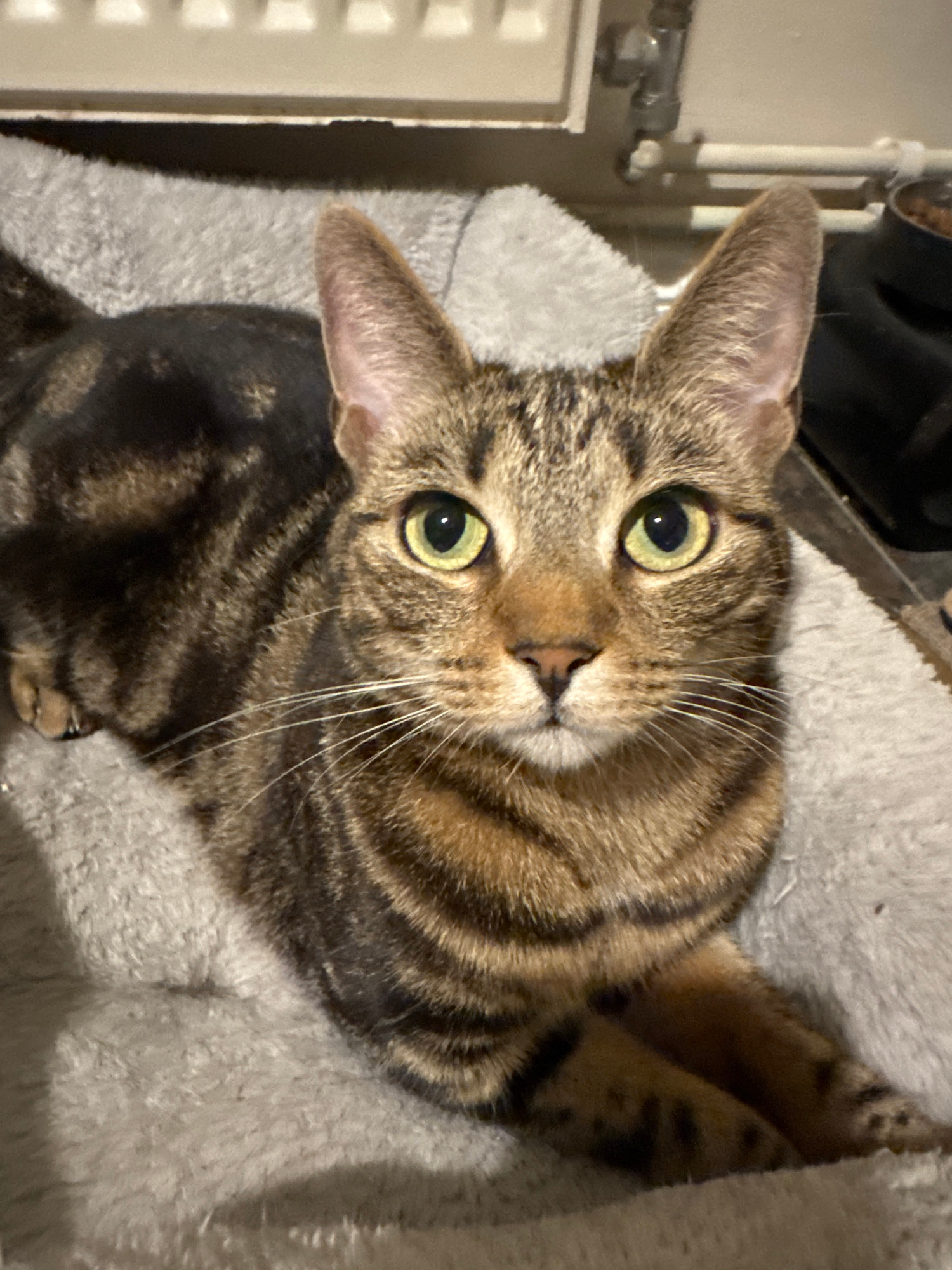 A close-up, slightly tilted photograph features a brown tabby cat with distinctive black stripes and large, round, greenish-yellow eyes. The cat is looking directly at the viewer with an attentive exp…read more
